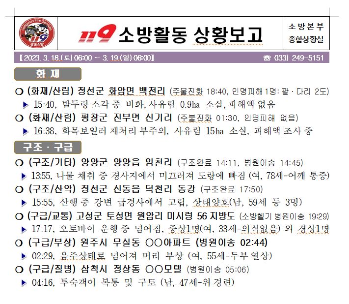 119 소방활동 상황보고(3. 19. 일) 06:00