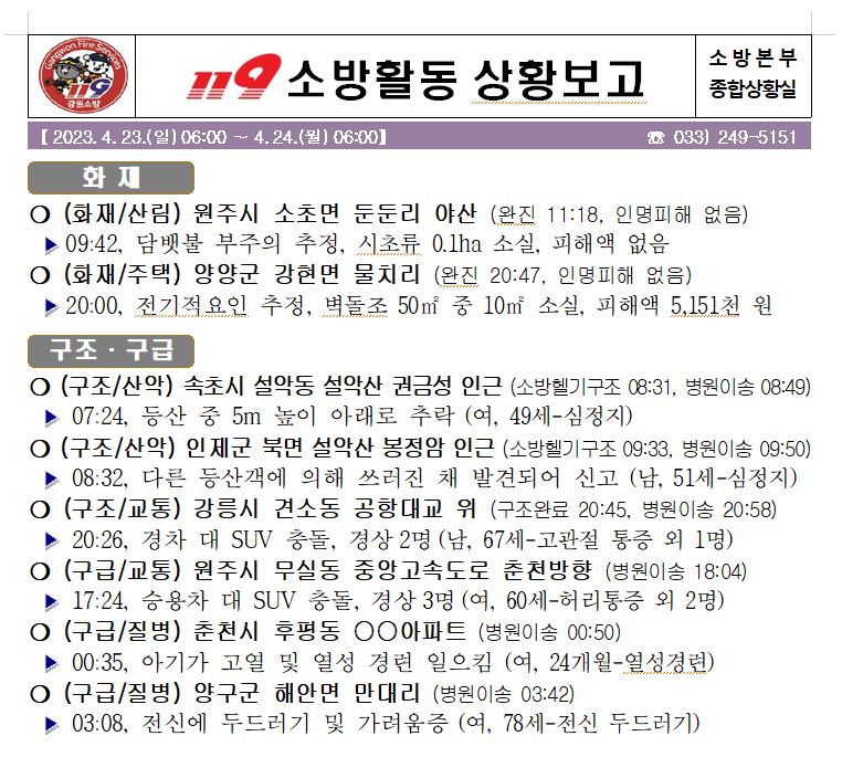 119 소방활동 상황보고(4. 24. 월) 06:00