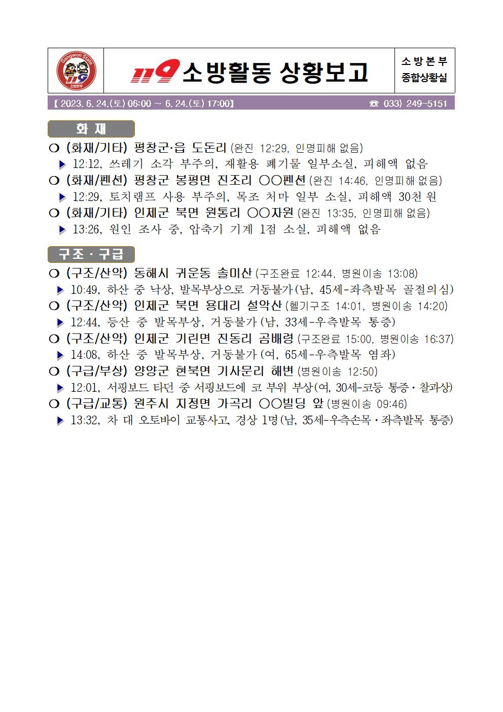 119 소방활동 일일상황보고(6.24.토) 17:00