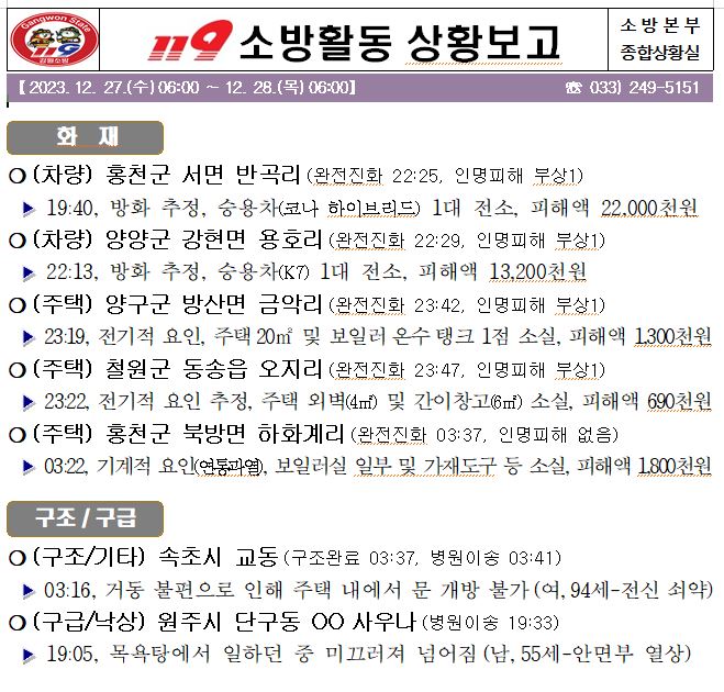 119 소방활동 일일상황보고(12.28.목) 06:00