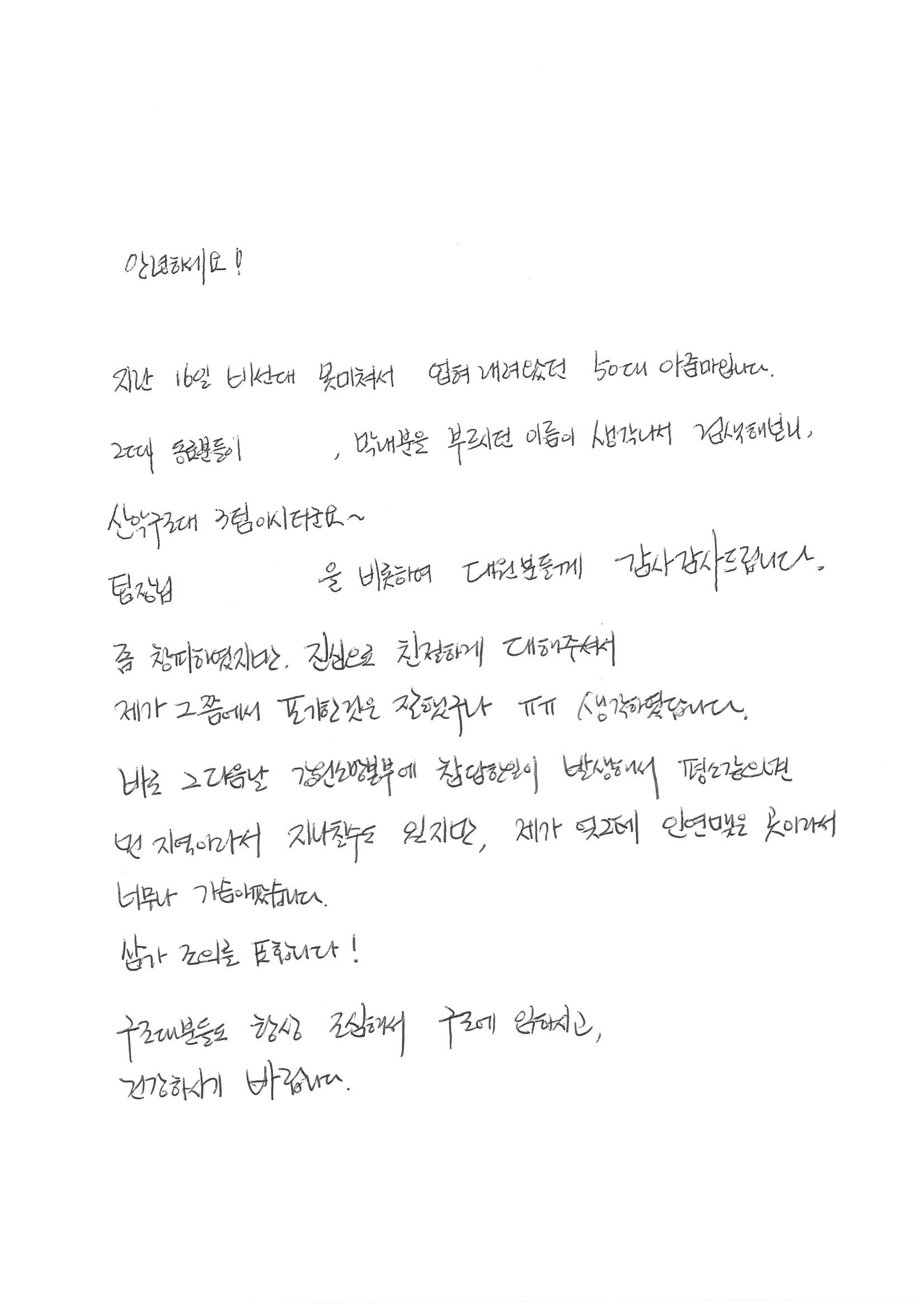 구조 수혜를 받으신 OOO님께서 감사편지를 보내주셨습니다.