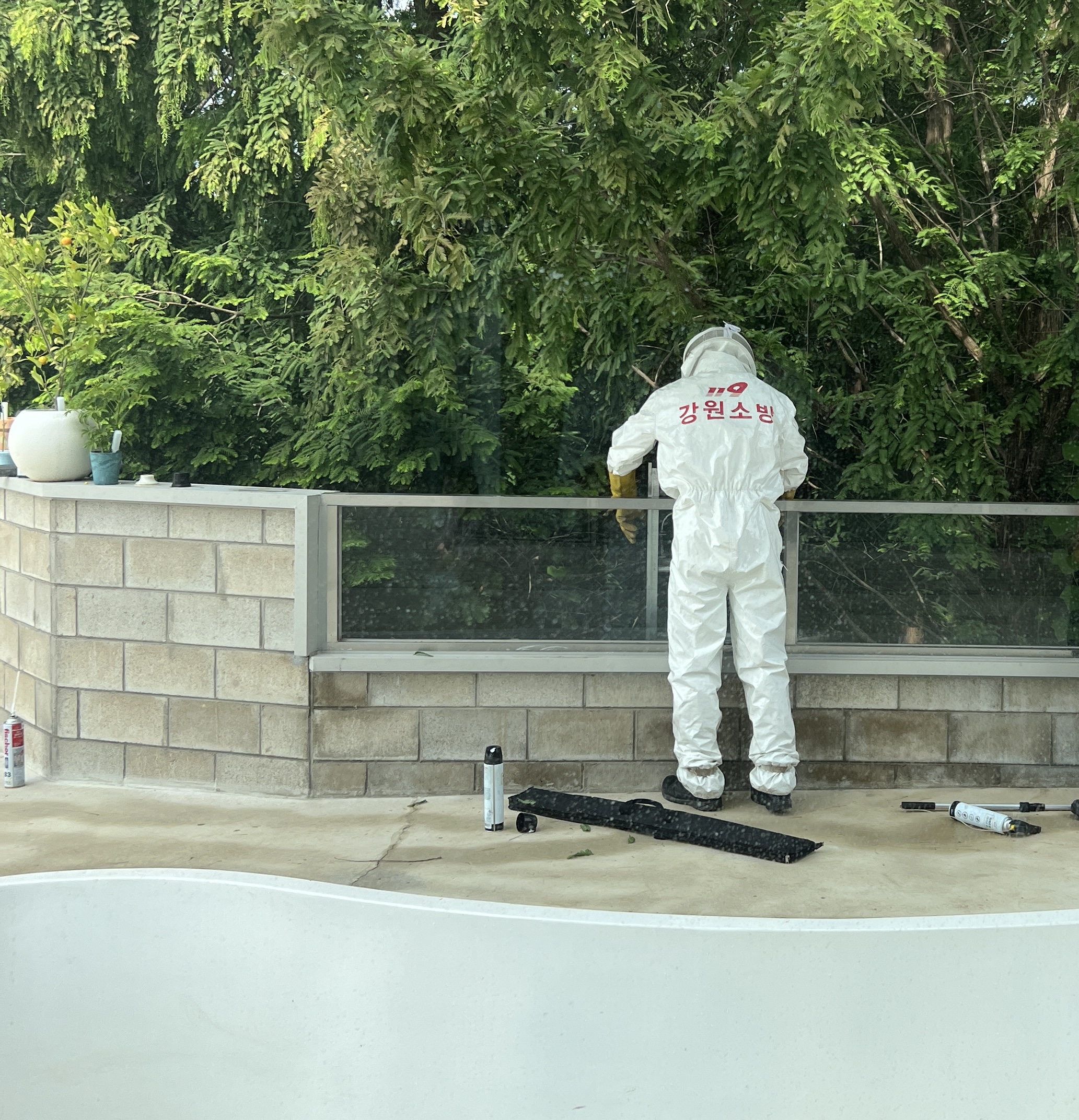 35도의 땡볕에서 방호복 입고 사다리 타고 석축에 숨겨진 장수말벌집을 말끔히 처리해 주셨습니다.