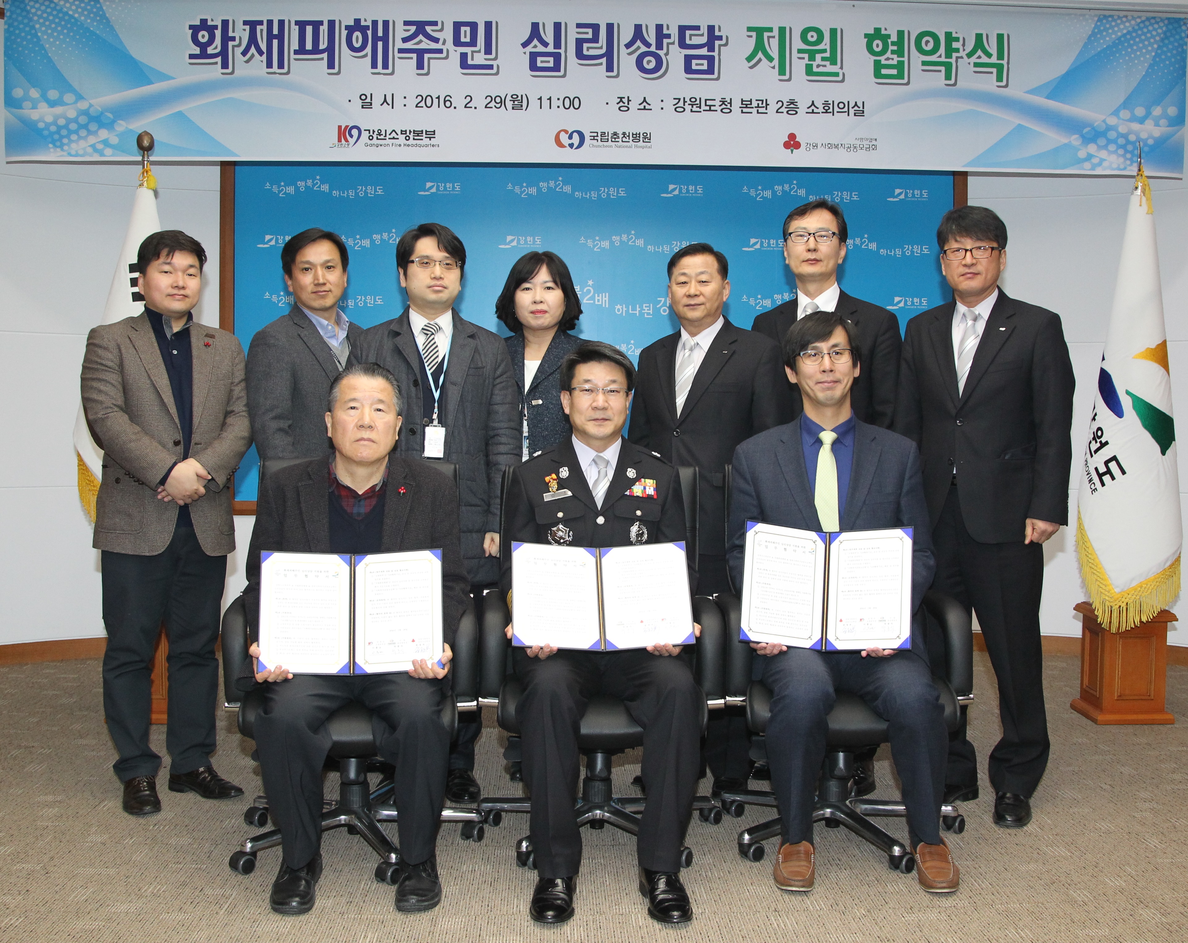 강원도소방본부는 국립춘천병원, 강원사회복지공동모금회와 화재피해 주민을 위한 심리상담을 할 수 있는 업무협약을 체결하였습니다.