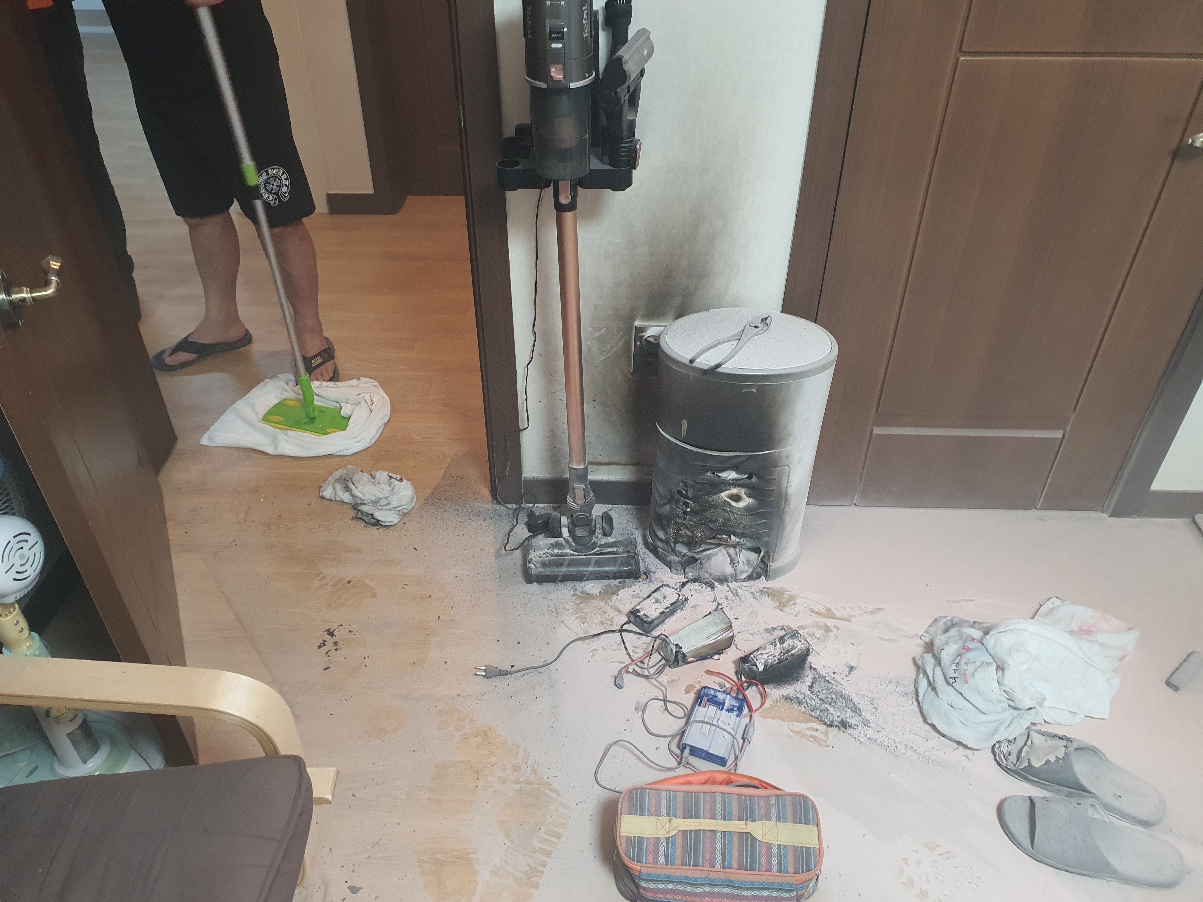 ○ 해당 화재사례 원인분석 결과 리튬이온 배터리는 습기에 매우 취약함에 따라 바닥에 떨어뜨리고 외력이 가해졌을 때 배터리팩 자체의 방수성능이 저하되어 수분이 팩 내부로 침투할 수 있고, 이때 내부 구성 물질과의 화학반응을 통해 화재로 이어졌다.