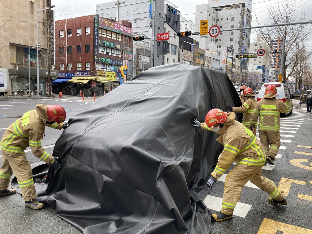 ○ 용석진 예방안전과장은“지하층에서 전기차화재가 발생하면 진화에 어려움이 많다.”면서“화재의 신속한 진화와 피해의 최소화를 위해 대응에 유용한 질식소화포를 비치해 달라.”고 말했다.