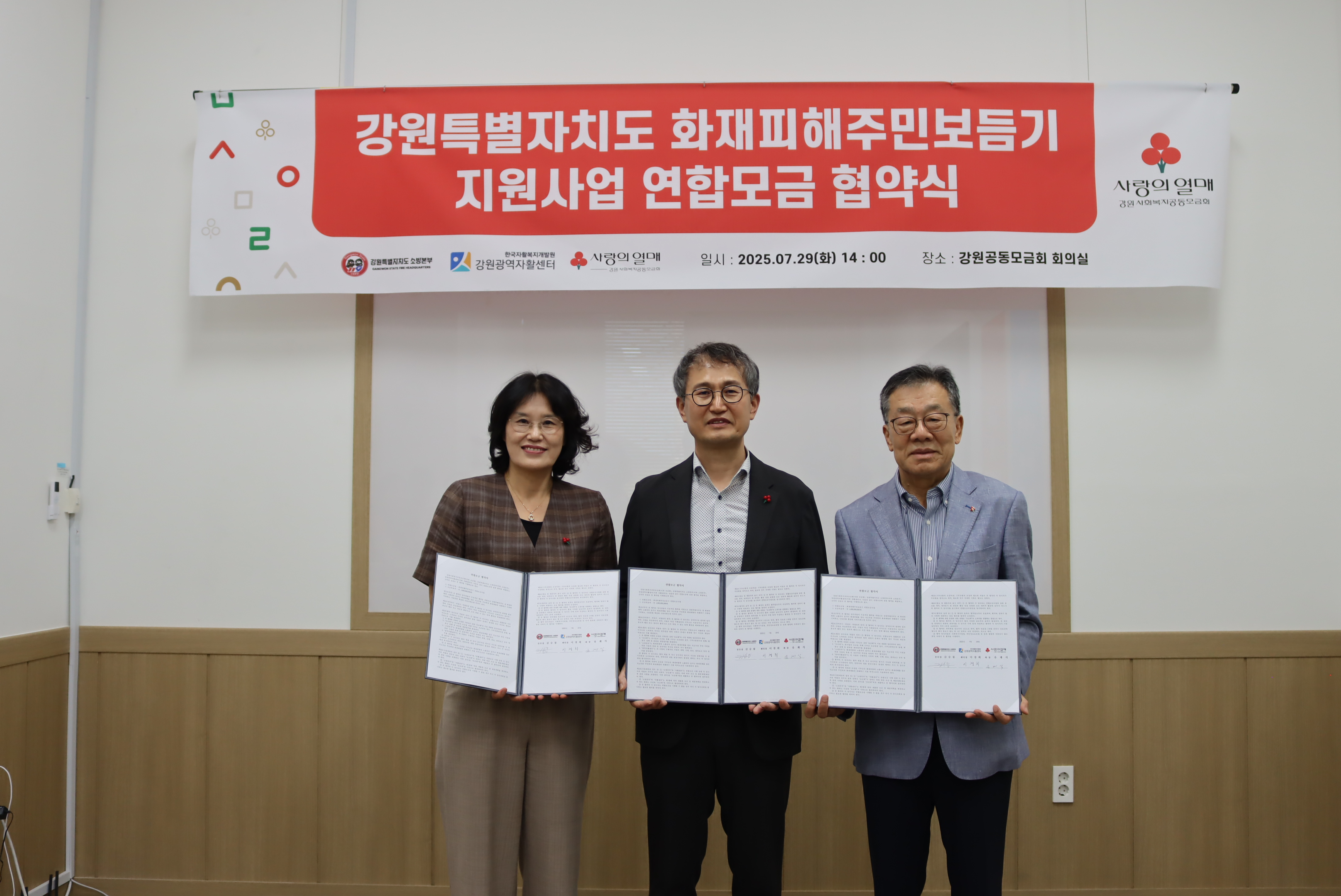 ○ 강원특별자치도 소방본부(본부장 김승룡)는 7월 29일 강원사회복지공동모금회, 강원광역자활센터와 함께 ‘화재피해주민 보듬기 연합모금’ 추진을 위한 업무협약을 체결했다고 밝혔다.