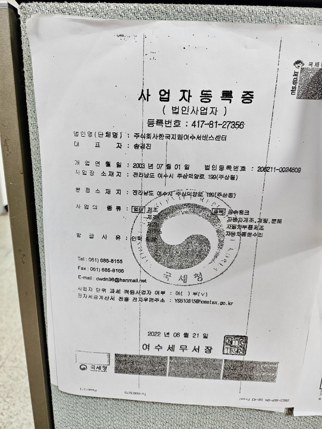 혹시나 사업자등록증 사진이 있다면 더 확실하게 보실수 있으실거 같아서 첨부 해봅니다!! 급수는 1급 정비소 입니다(자동차종합수리)