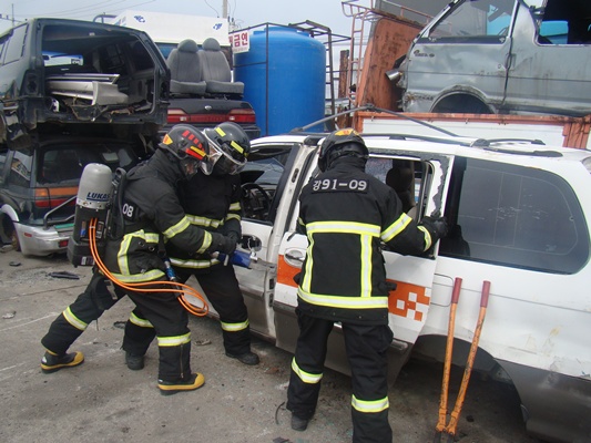 이번 훈련은 폐차장에서 실물차량을 이용하여 구조 시, 효율적인 유압장비 사용법과 사고유형별 구조기법 숙달하는 것에 중점을 두고 실시하였으며, 실제 교통사고 현장을 가상하여 팀별로 유압장비를 이용하여 차체를 벌리거나, 절단 및 해체하는 연습을 하여 훈련의 성과를 높였다.