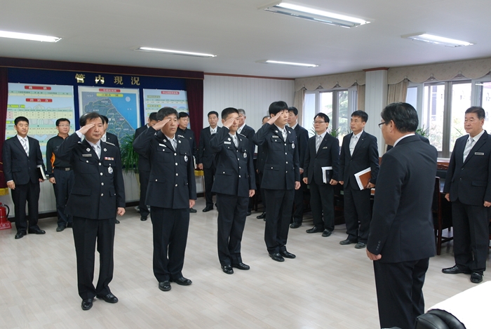 서장실에서 인사발령자 4명(복직 1, 전입 1, 자체 2)에 대한 신고식을 가졌습니다.