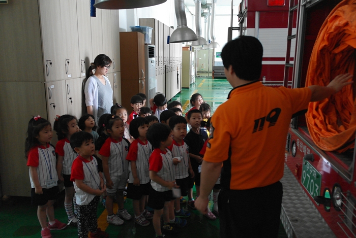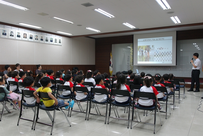 강릉소방서(서장 김남숙)는 2013. 6. 18~19(2일간) 10시30분 강릉소방서 대회의실 및 현장대응과 차고 앞에서 강릉상아어린이집 어린이 및 인솔교사 100여명을 대상으로 어린이 소방안전교육을 실시하였습니다. 어린이들에게 소방서의 역할, 소방관이 하는 일, 화재시 대피요령과 신고방법에 대해 교육하였으며, 물소화기와 차량탑승 체험을 해보는 시간도 가졌습니다.
