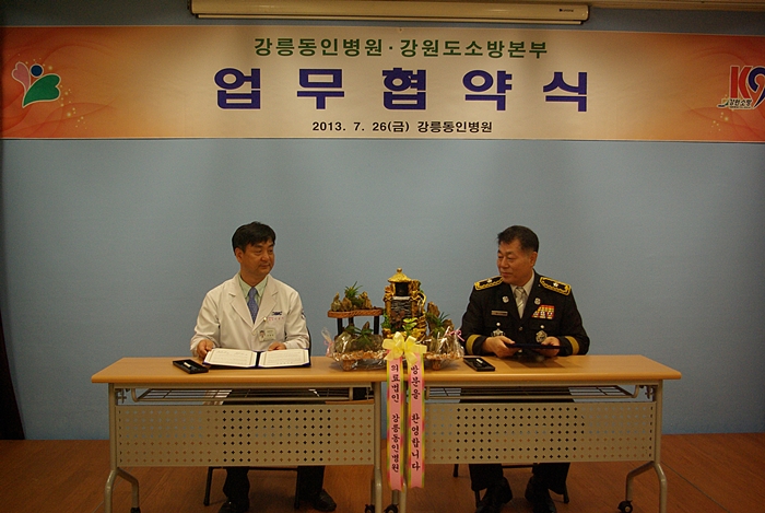 7월 26일 11:30 강릉동인병원 응급센터 지하 강의실에서 오대희 강원소방본부장 , 박창진 강원소방행정과장, 정은철 강릉소방서장 등 소방 및 강릉동인병원 관계자 20여명이 참석한 가운데 강원도소방본부와 강릉동인병원 간 소방전문치료센터 업무협약식을 체결하였습니다.