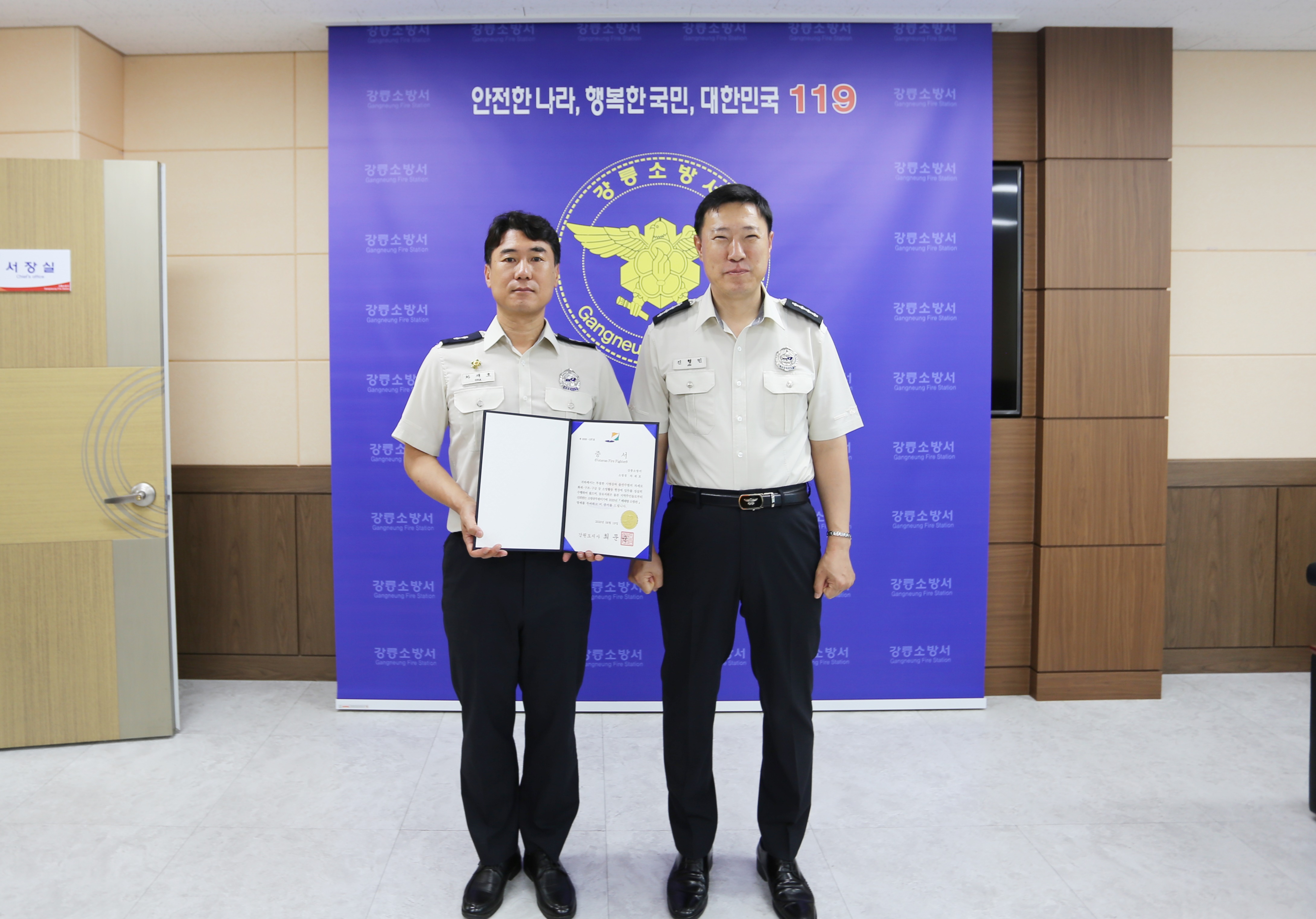 강릉소방서(서장 진형민)는 19일 오전 9시 강릉소방서 서장실에서 제12회 베테랑소방관에 선정된 경포119안전센터 차재호 센터장에게 증서와 배지를 수여했다고 밝혔다.