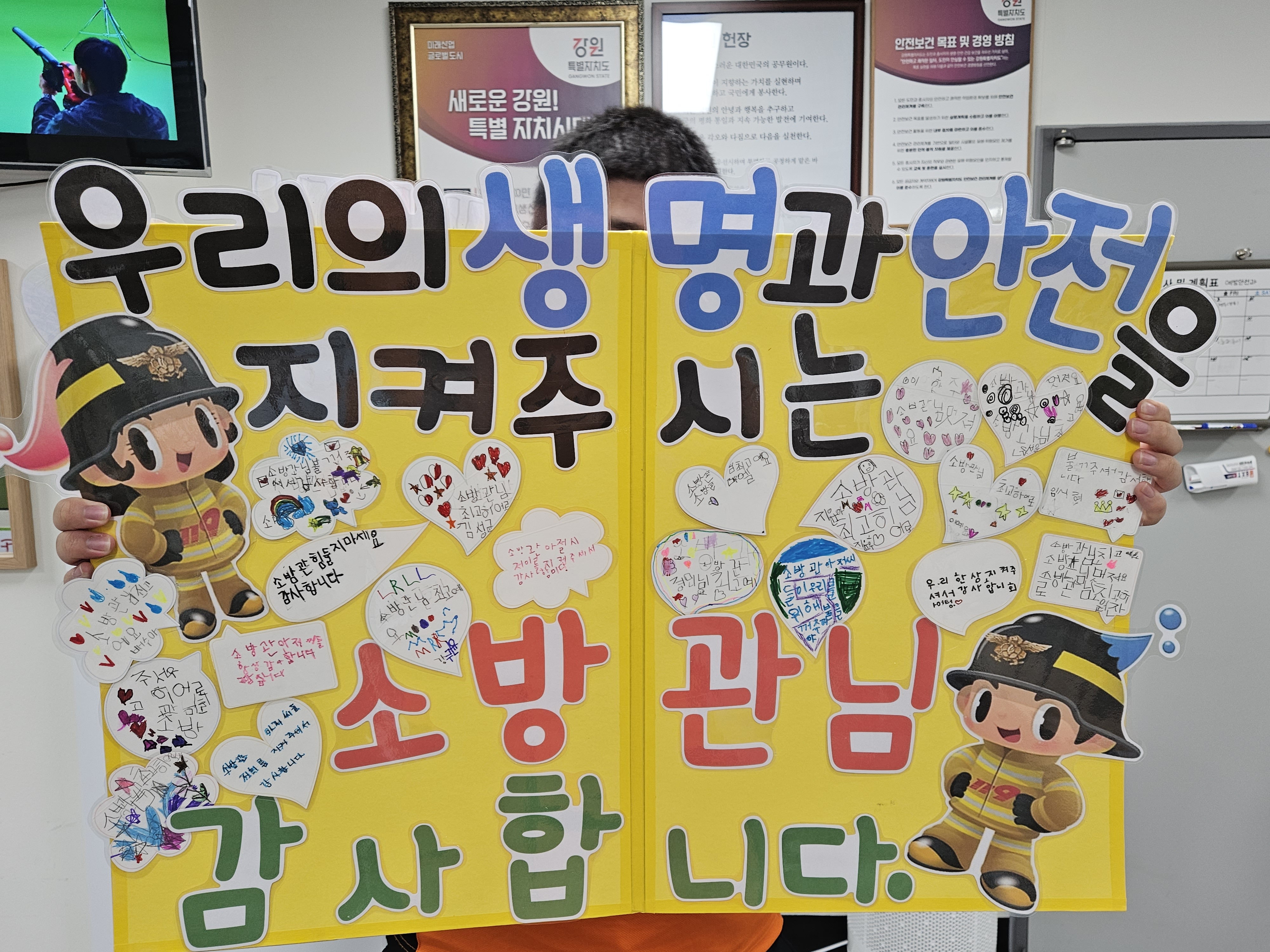 강릉소방서에 견학온 유치원생분들이 소방관들을 위한 깜짝 선물을 주셨습니다.