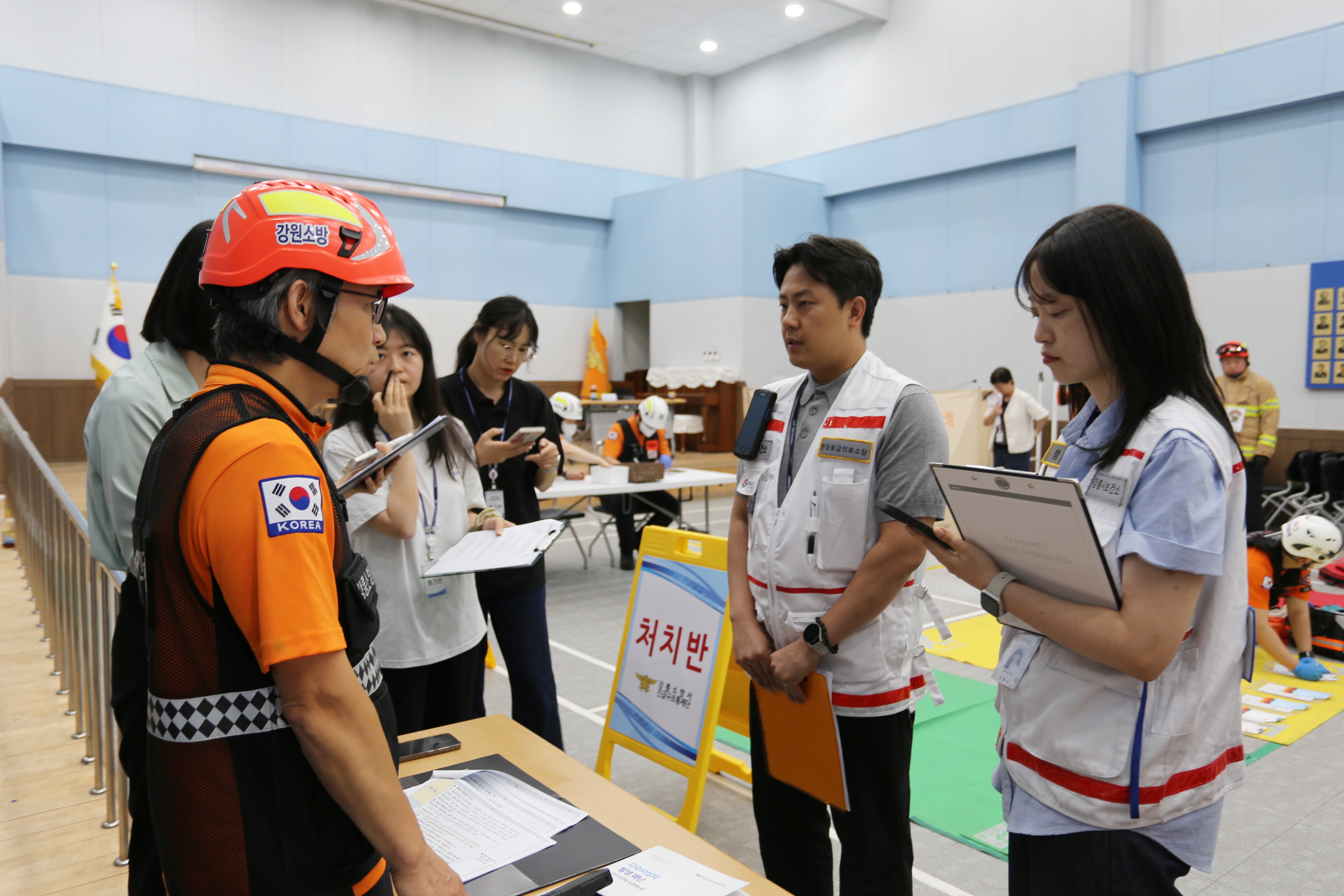 강릉소방서 구급대원 68명은 대회의실에서 다수사상자 구급 대응응 훈련(평가)를 실시하였습니다!