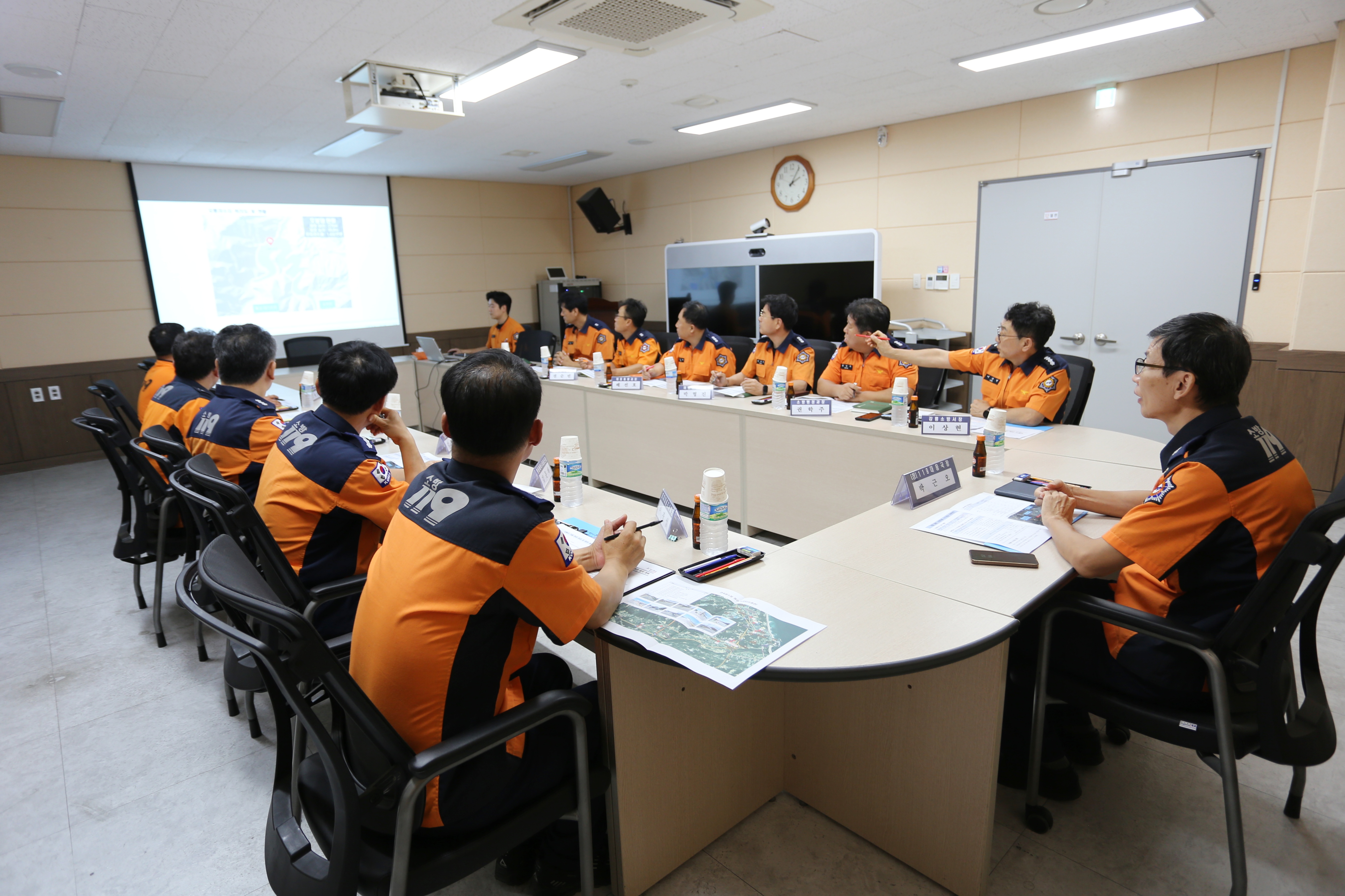 박근오 대응국장은 이상현 소방서장으로부터 소방차량 식수공급 및 소방용수 확보 배치계획을 보고받고 강릉시 가뭄 대응에 대하여 논의하였습니다.