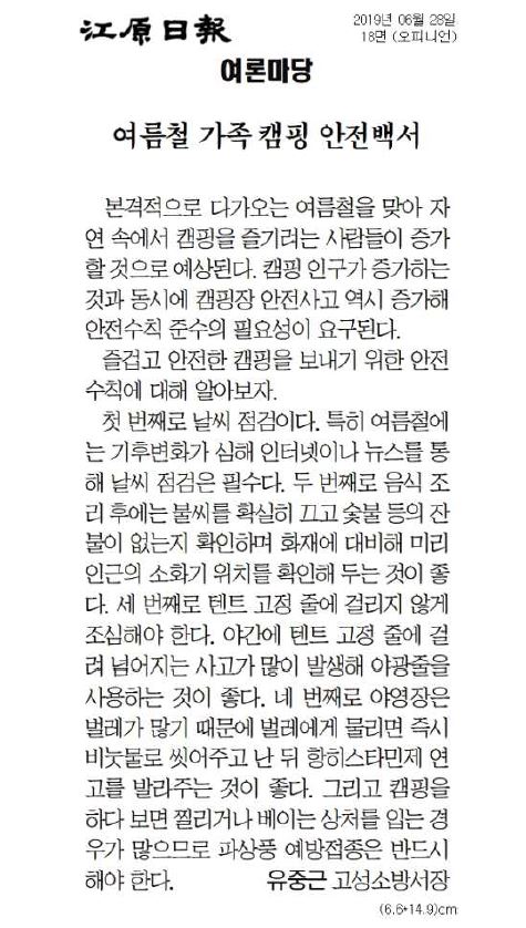 | 92 | 유중근 서장 기고문 - 캠핑장 안전수칙 준수로 힐링을 떠나보자 | 예방홍보 | 2019-06-27 | 802 | |