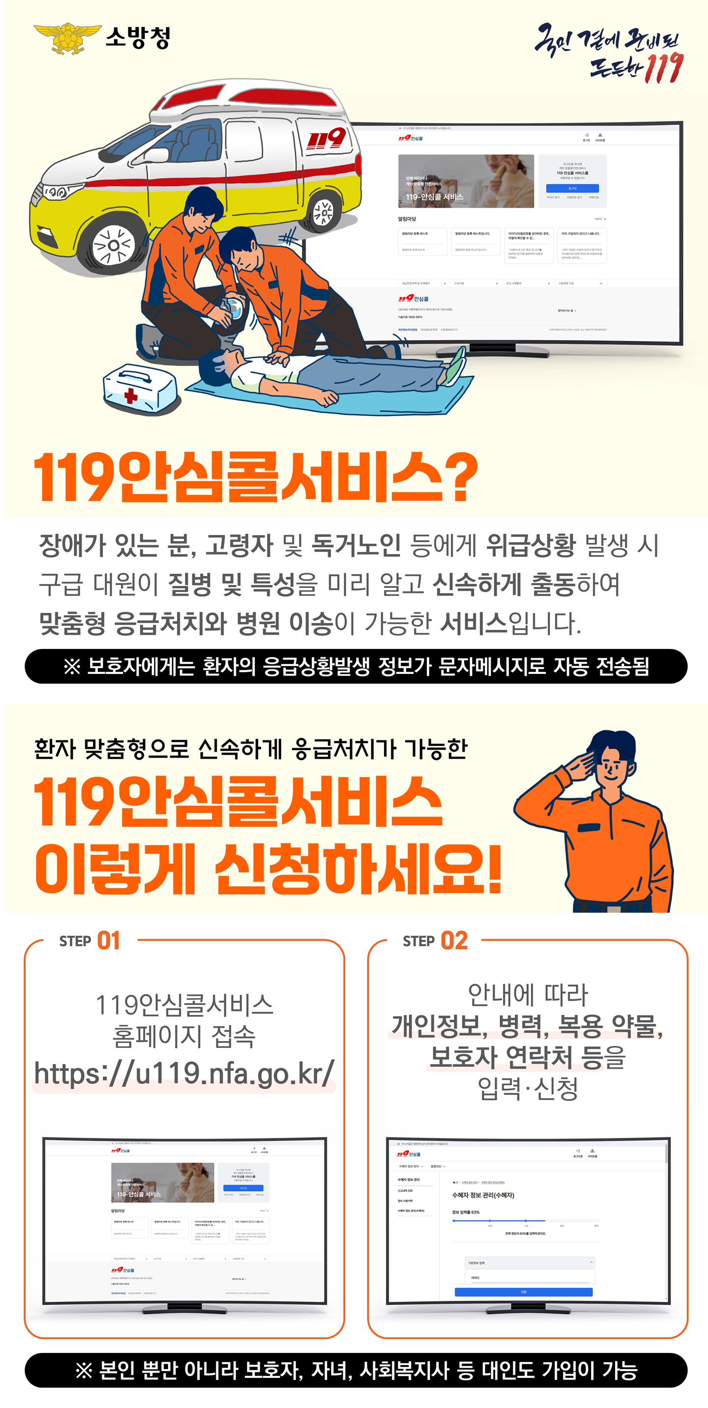 위급상황이 발생해 등록된 전화번호로 119상황실로 신고시, 환자의 정보가 구급대원에게 제공되어 출동시 신속하게 대비할 수 있는 서비스입니다.