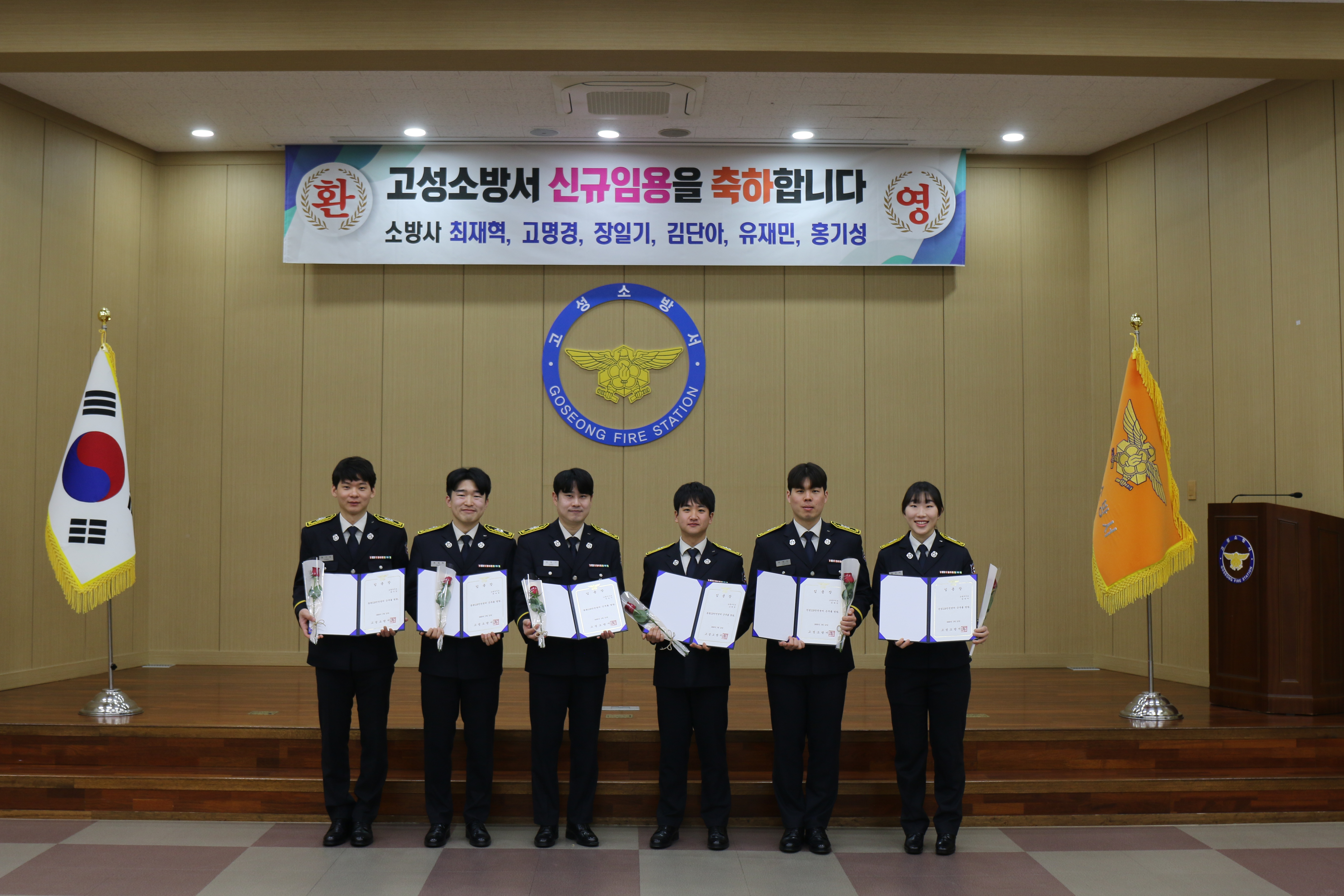 강원고성소방서(서장 김진문)는 12일 오전 본서 대회의실에서 신규 소방사 시보 김단아 외 5명, 전보자 소방장 박정진에 대한 신규 소방공무원 및 전보자 임용장 수여식을 실시했다.