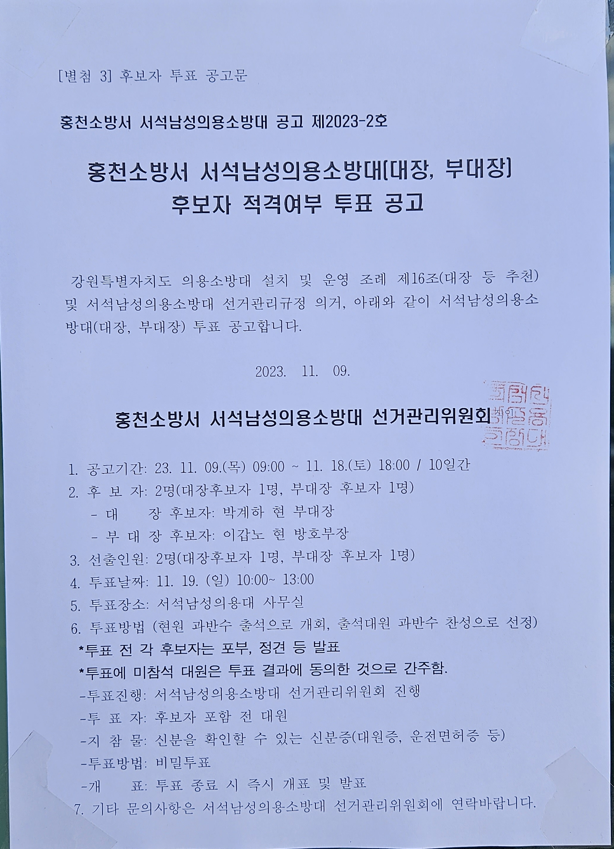 홍천소방서 서석남성의용소방대 대장, 부대장 후보자 적격여부 투표 공고.png
