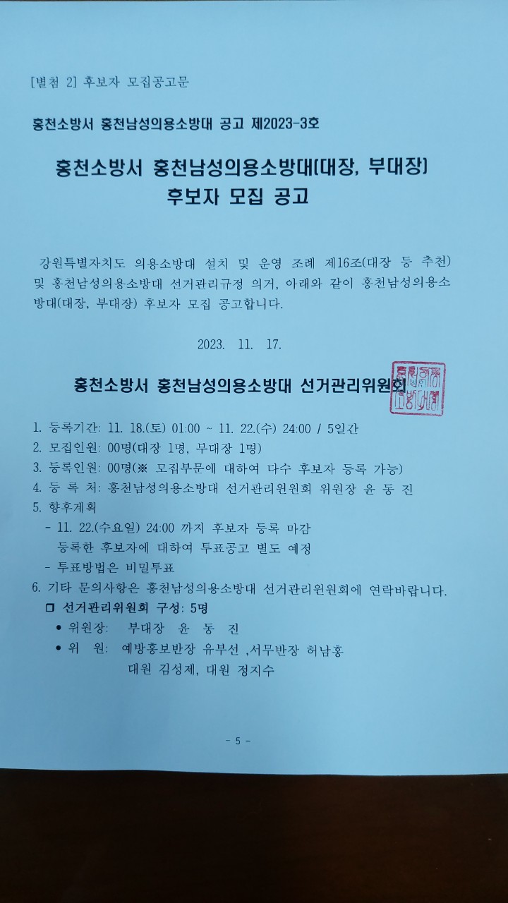 2024년 의용소방대장(부대장) 임명을 위한 후보자 추천 및 투표 공고 알림(홍천남성의용소방대)
