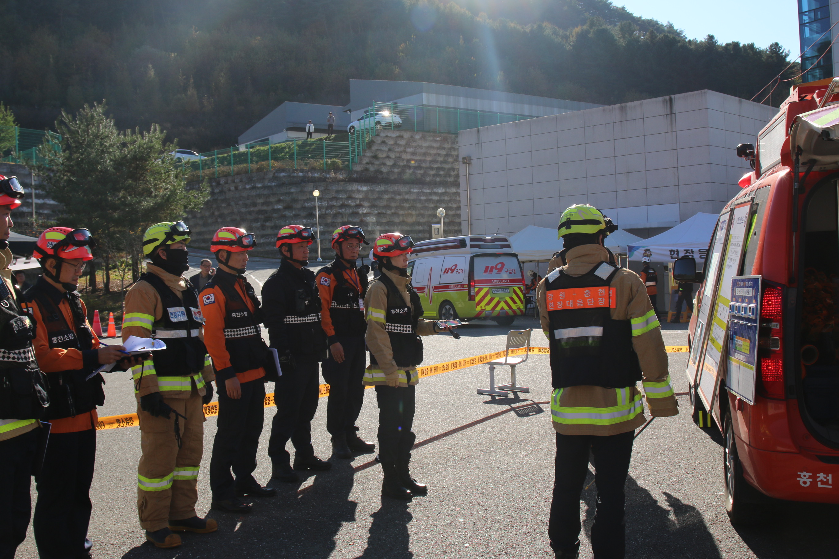 이번 훈련에는 소방서와 홍천군청, 홍천경찰서, 홍천군보건소 등 22개 기관 및 단체에서 297명의 인원과 장비 56대가 동원됐으며, 신영재 홍천군수를 비롯하여 민철홍 홍천교육지원청교육장 외 30여 명의 내빈들이 참석한 가운데 진행되었다.