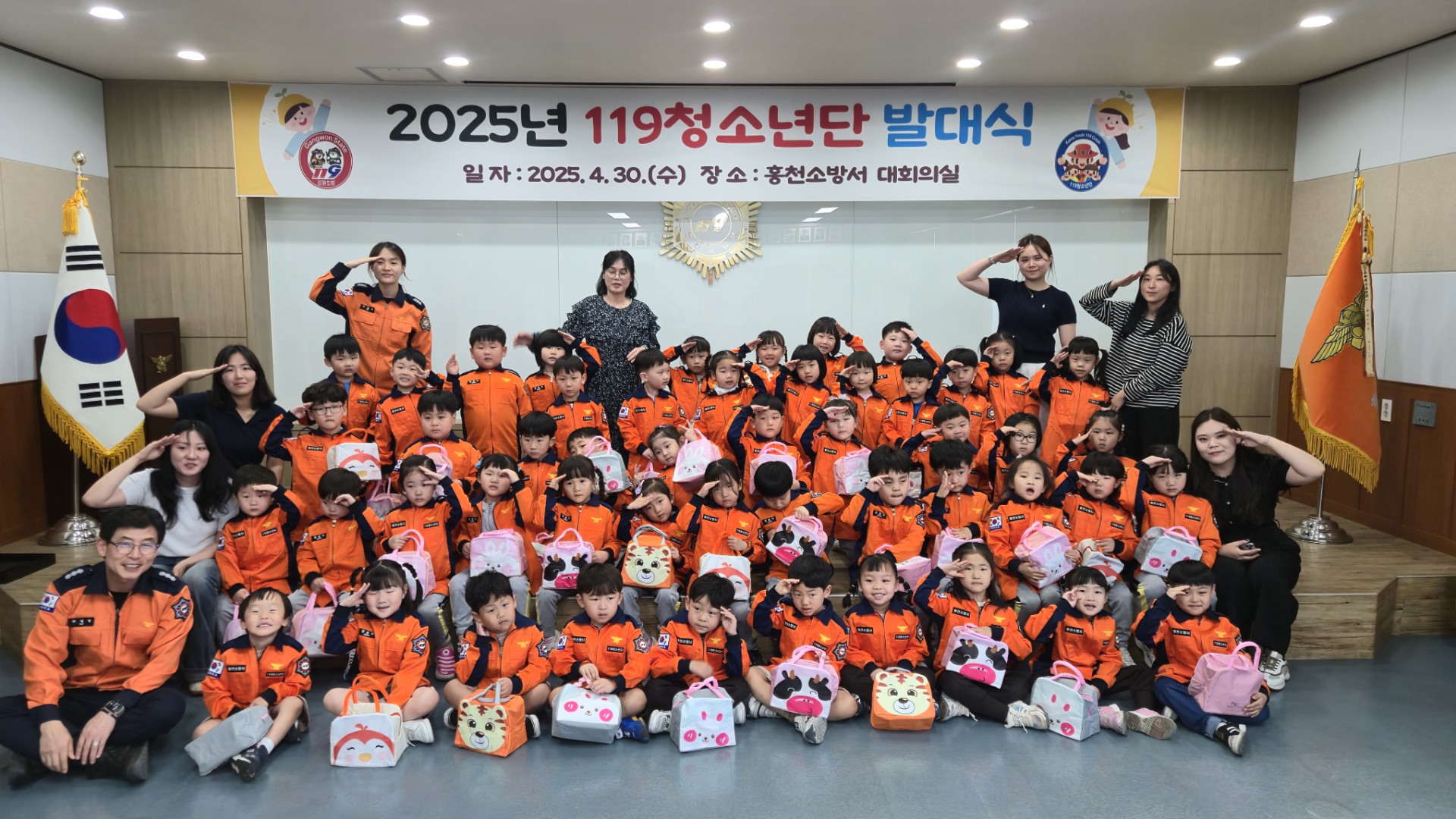 이번 발대식은 지역 내 유치원생들로 구성된 119청소년단의 공식 출범을 알리는 자리로 강룡사유치원, 마야유치원, 홍천유치원, 희망어린이집 총 4개 유치원에서 119명의 단원이 참가했다.