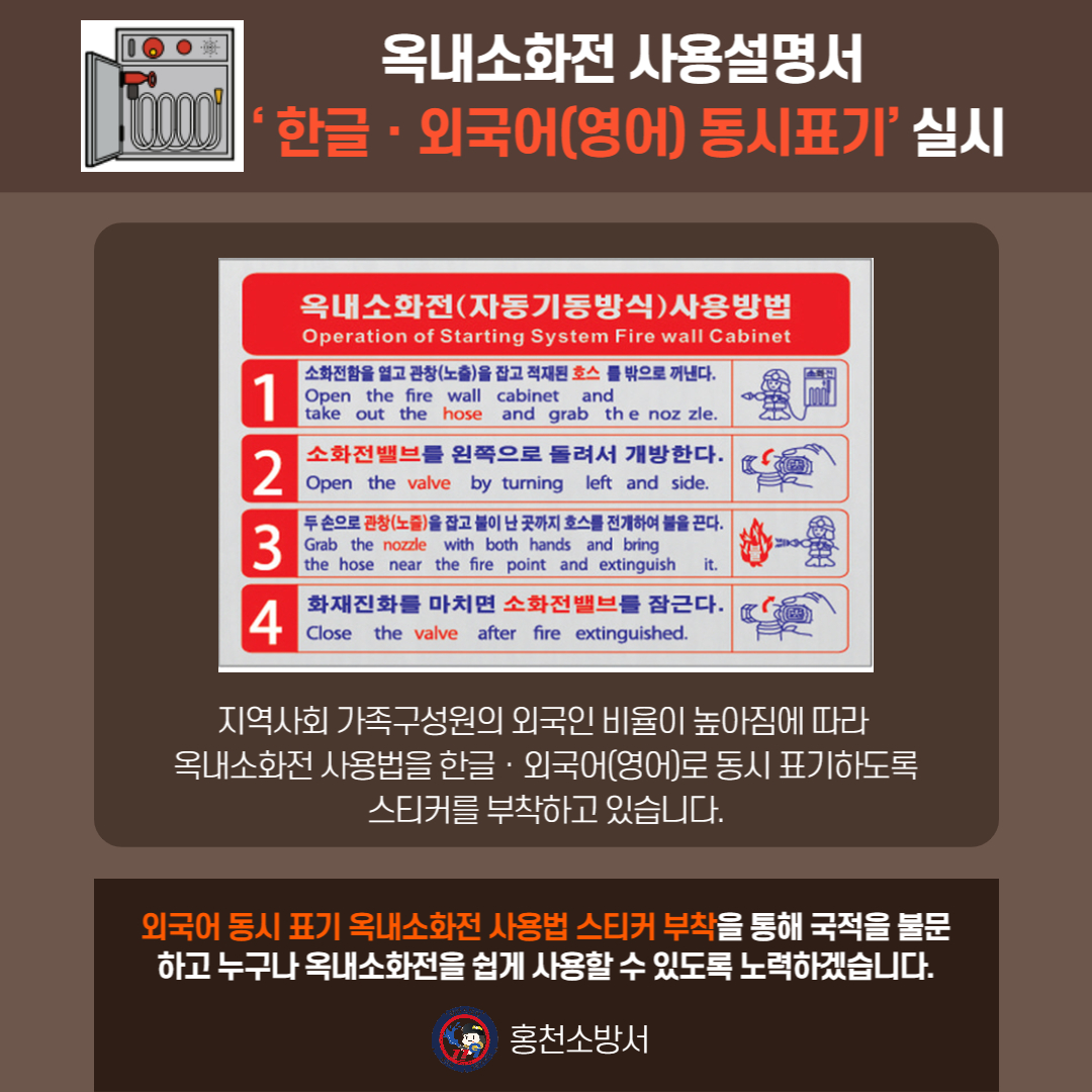 옥내소화전 사용설명서 외국어 동시표기 스티커 부착 홍보