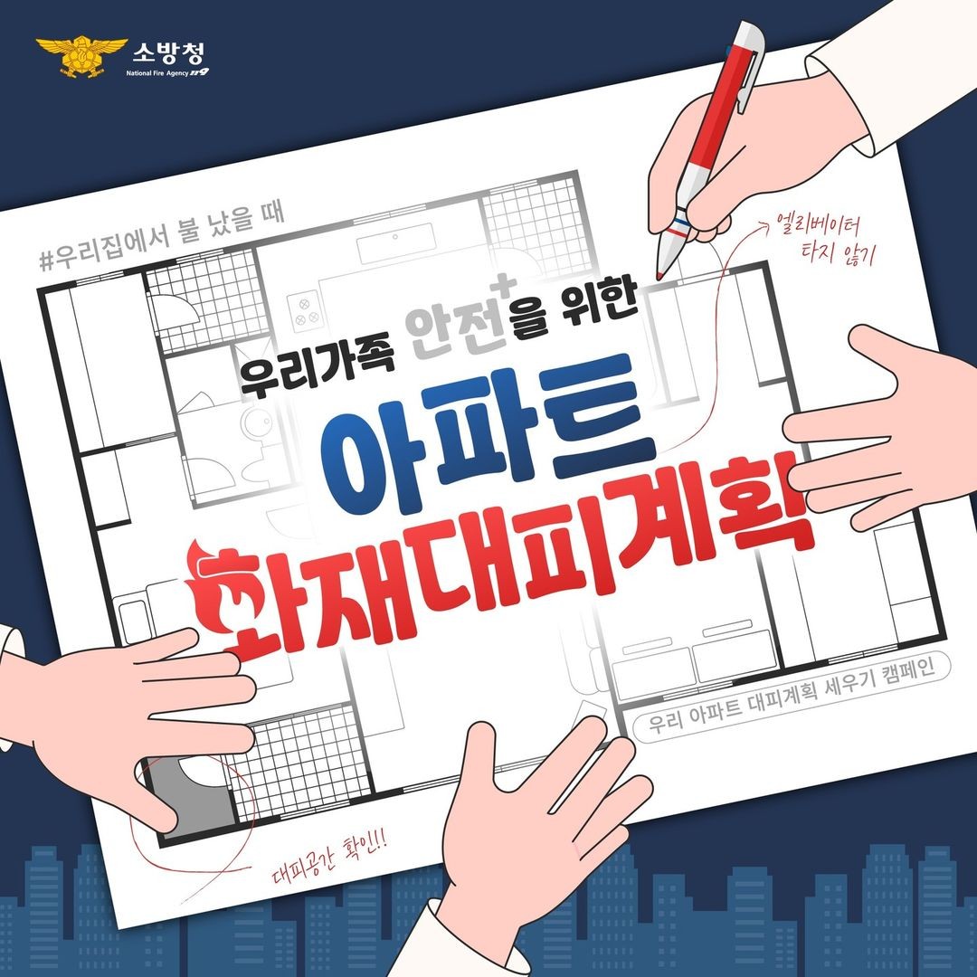 불나면 살펴서 대피 할 수 있도록 화재상황별 대처법을 사전 숙지하기 위한 우리아파트 대피계획 세우기 캠페인에 적극적인 동참 바랍니다.