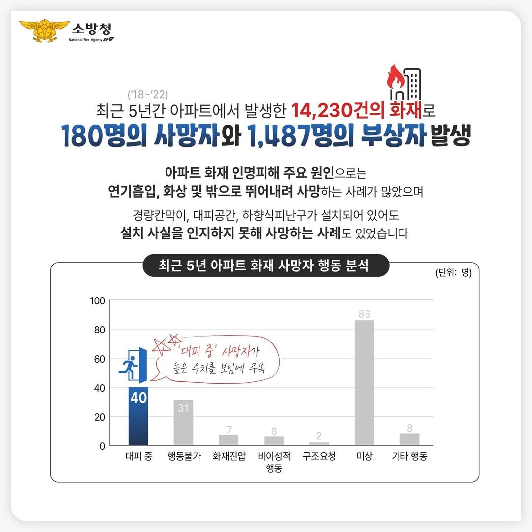 최근 5년간 아파트에서 발생한 화재를 통해 사망자 180명 중 40여명의 높은 수치로 대피중 사망사례가 높다는 점이 주목되고 있습니다.