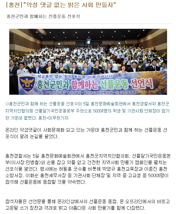 강원일보 "선플운동 선포식"(7.6)