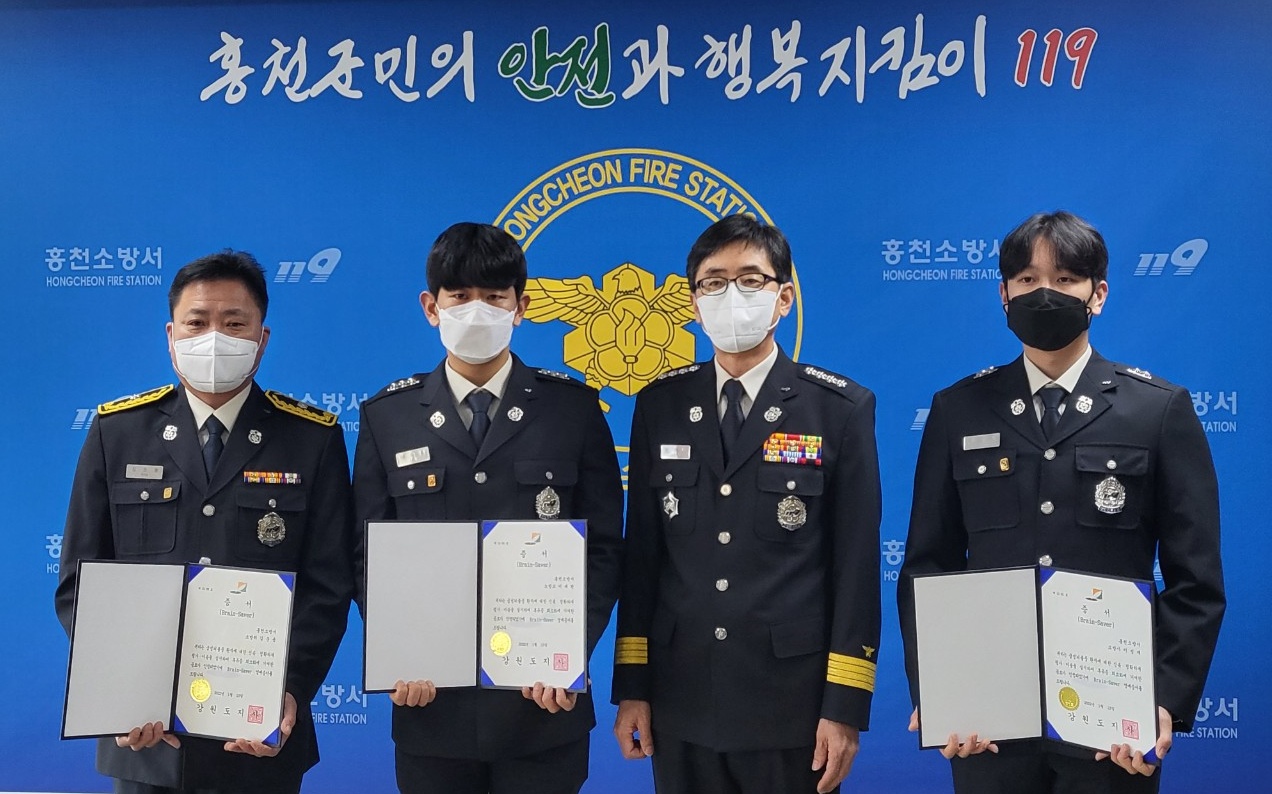 홍천소방서(서장 정재덕)는 어제(8일) 오전 10시 신속한 응급처치로 시민의 소중한 생명을 구한 구급대원 3명에게 브레인세이버 인증서와 배지를 수여했다고 밝혔다.