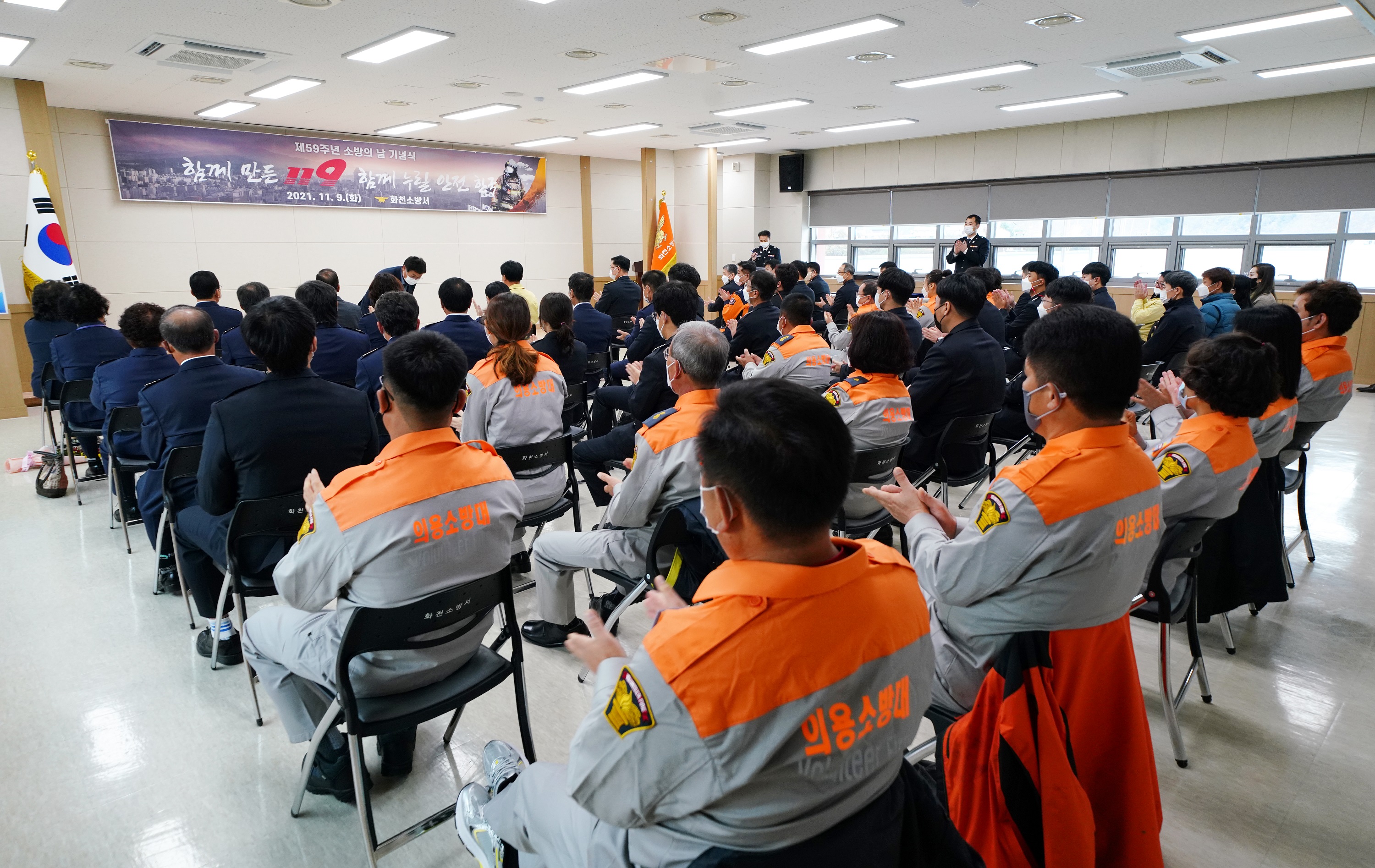 □ 화천소방서(서장 허강영)는 11월 9일 오전 10시 제59주년 소방의 날을 맞아 국민의 생명과 재산 보호를 위해 헌신한 소방공무원과 의용소방대원, 소방행정 발전에 기여한 시민을 위한 기념행사를 실시했다.