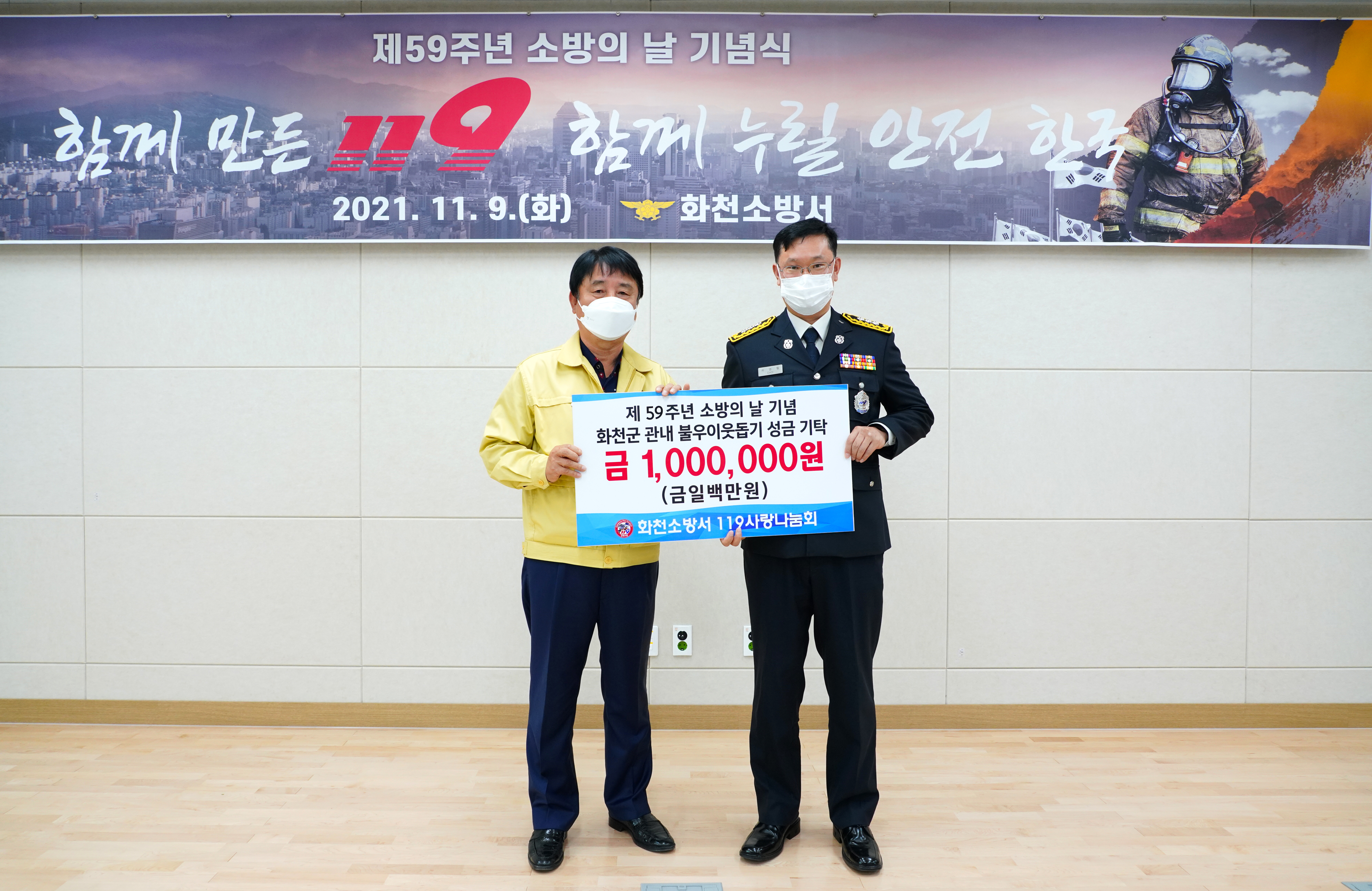 □ 화천소방서(서장 허강영)는 소방의 날을 맞아 불우이웃돕기 성금 100만원을 화천군에 기탁했다고 밝혔다.