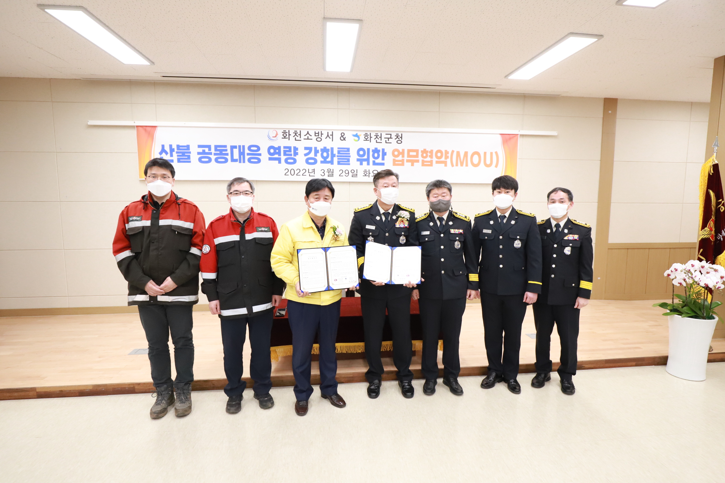 화천소방서는 3월 29일 오전 10시 본서 대회의실에서 제1회 의용소방대의 날 기념행사 및 산불대응 관련 화천군청과의 MOU 협약을 체결했습니다.