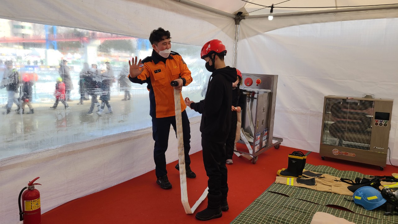 '2023 얼음나라 화천산천어축제' 소소심 소방안전체험장 소방홍보부스에서 관광객들에게 소화기 사용법, 심폐소생술 교육 등(주택용소방시설 설치하기 홍보)을 운영하고 있습니다.