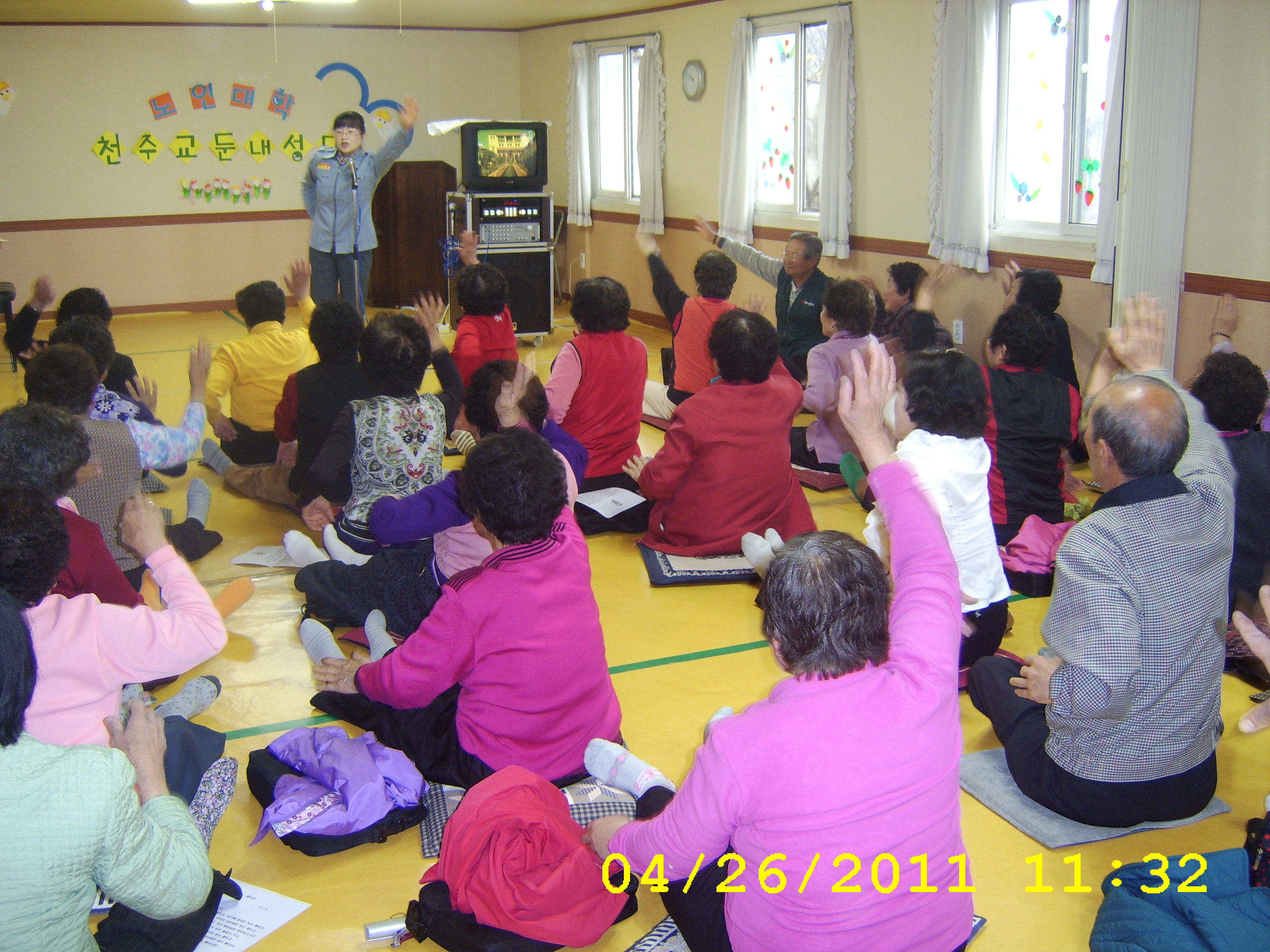 둔내노인대학에서 율동및 레크레이션 봉사를 하였습니다.