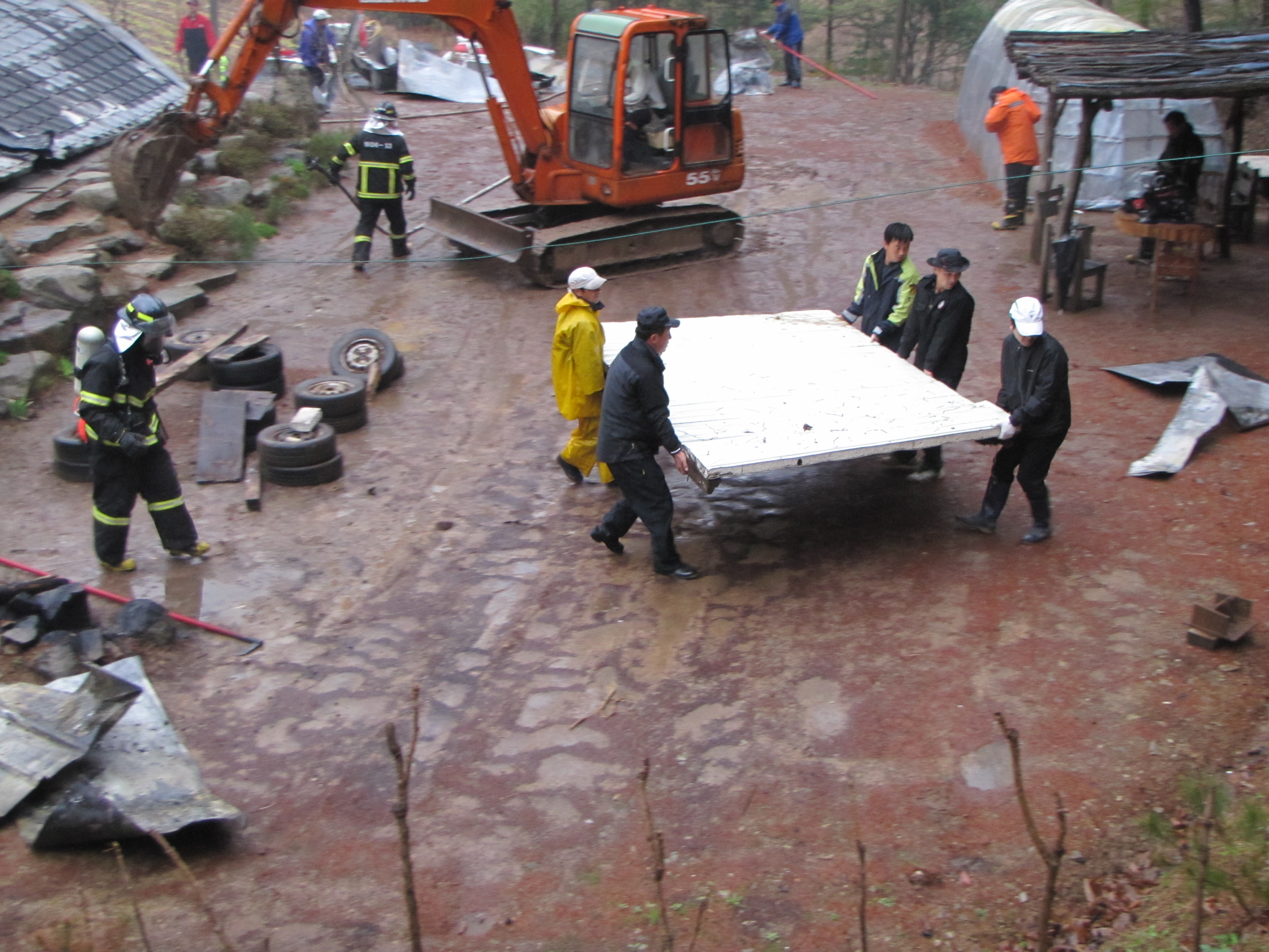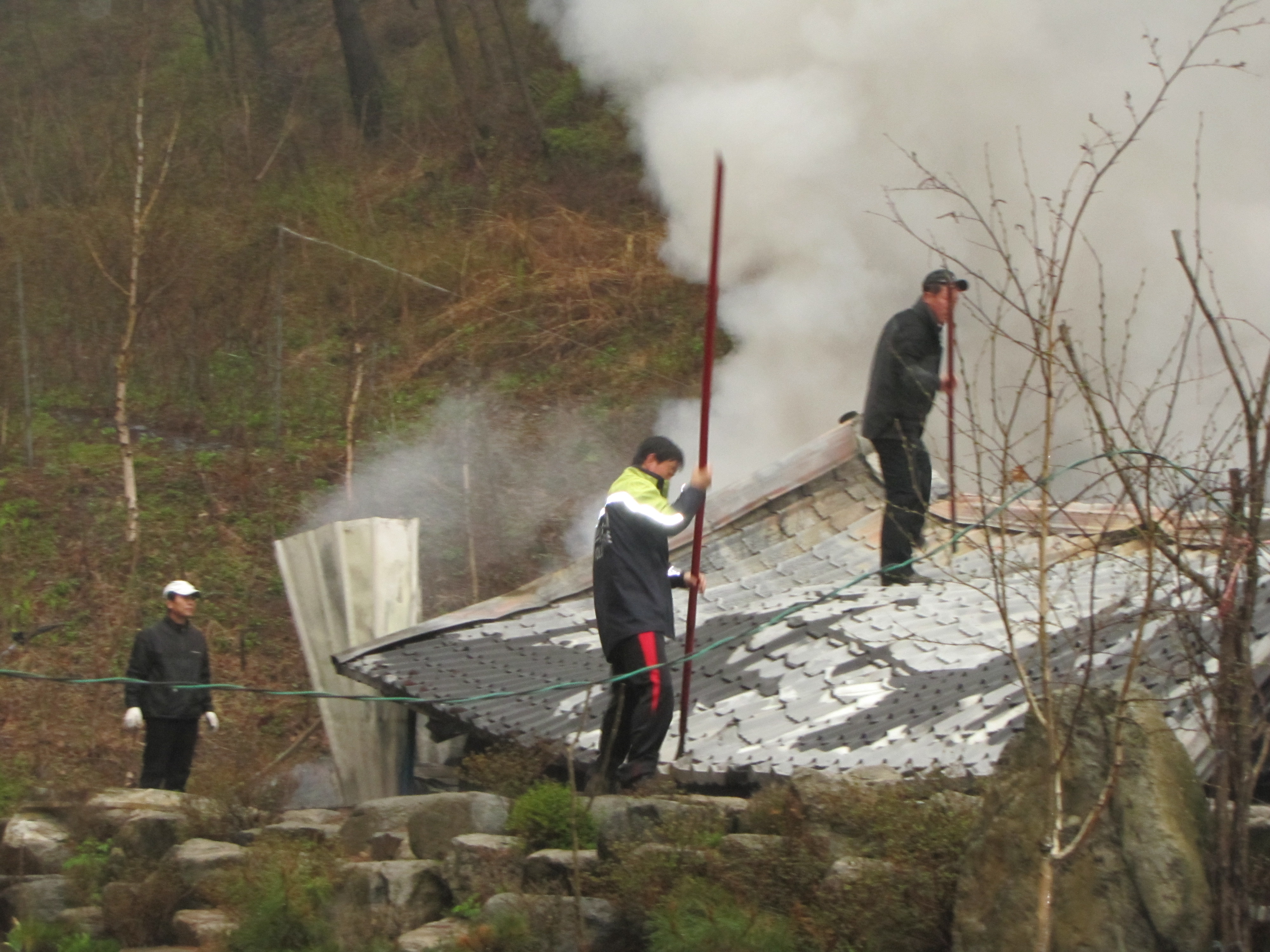 맞으며 화재 진압완료