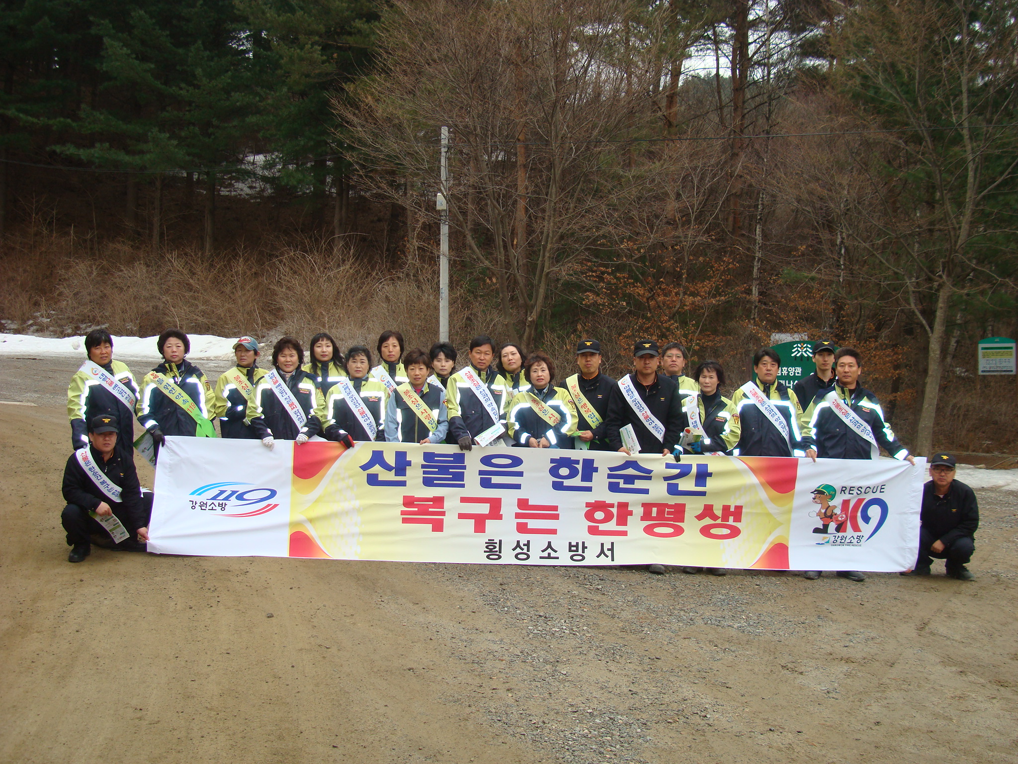 횡성소방서(서장 조근희) 2011. 4. 2.(토) 둔내119안전센터는 둔내남·녀 의용소방대와 함께 둔내 청태산 등산로에서 산불예방 플래카드를 설치하고 등산로 등 취약요소 정비, 제거 및 산불예방을 위한 시민계도, 구급대원 폭행방지 캠페인 , "소방차 길 터주기" 등 소방통로확보 홍보(전단지 배부)를 실시하였습니다.