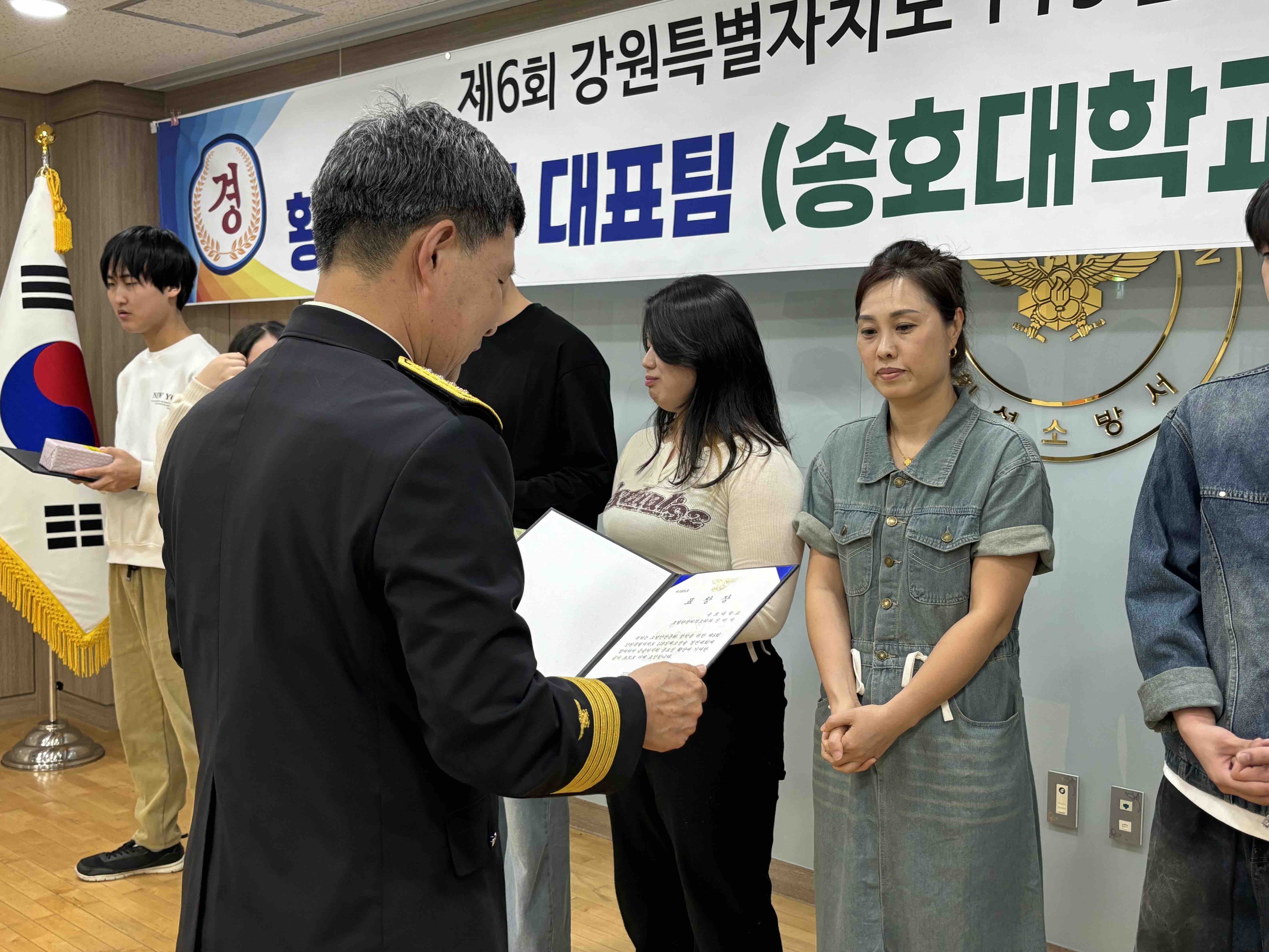 오늘 ‘제6회 강원특별자치도 119심폐소생술 경연대회'에 참가한 송호대학교 연합팀 학생 7명과 지도교수 3명에 대해 표창 수여식을 가졌습니다.