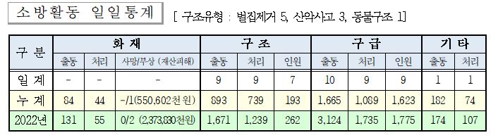 ○ 구조 9건(벌집 5, 산악사고 3, 동물구조 1)