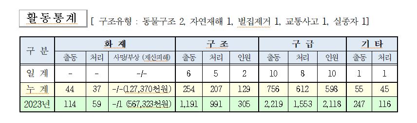 ○ 구조 6건( 동물구조 2, 자연재해 1, 벌집제거 1, 교통사고 1, 실종자 1)