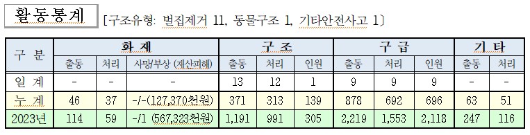 ○ 구조 13건(벌집제거 11, 동물구조1, 기타1)