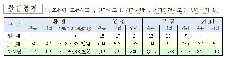 ○ 구조 48건(교통사고 1, 산악사고 1, 시건개방 1, 기타안전사고 3, 벌집제거 42)