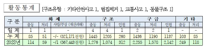 ○ 구조 1건(기타안전사고 1, 벌집제거 1, 교통사고 1, 동물구조 1])