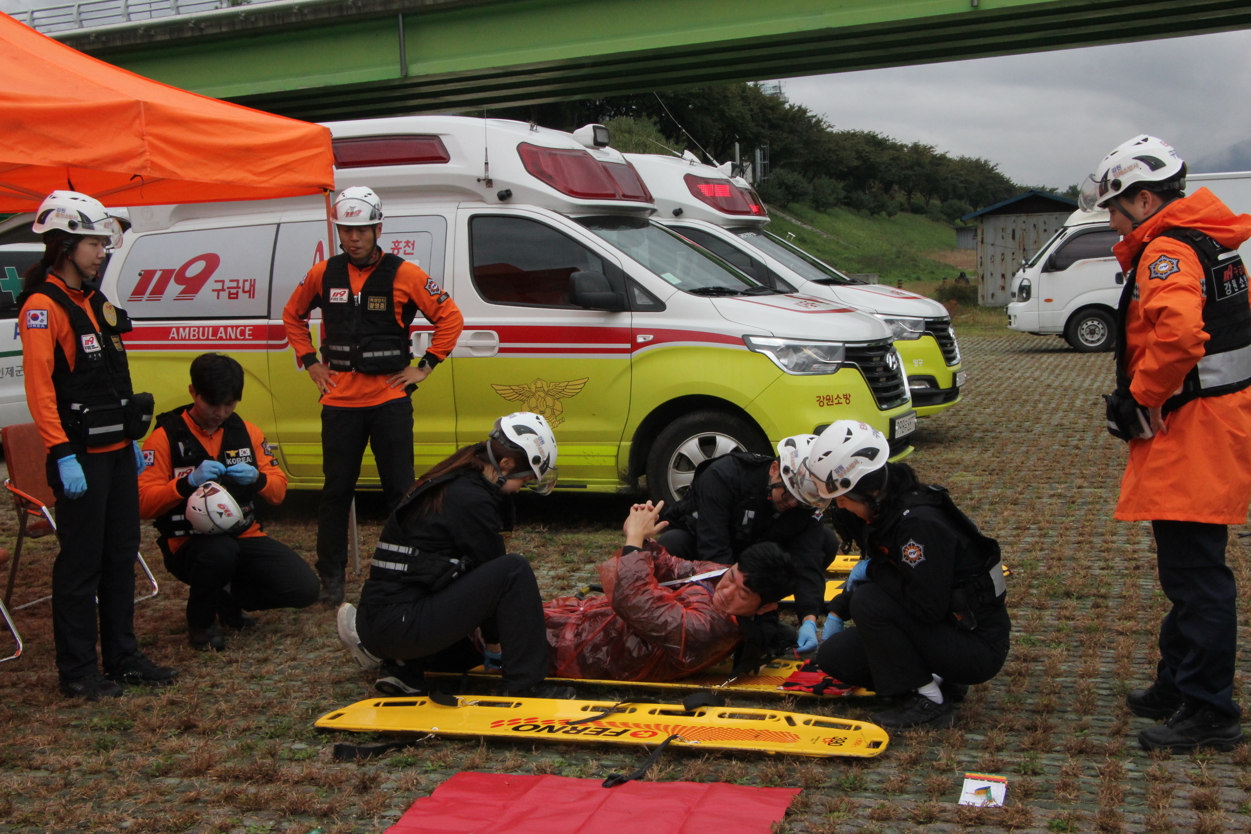 인제소방서에서 금일 14시에 인제읍 소재 살구미교 교량 아래에서 긴급구조훈련을 실시하였습니다.