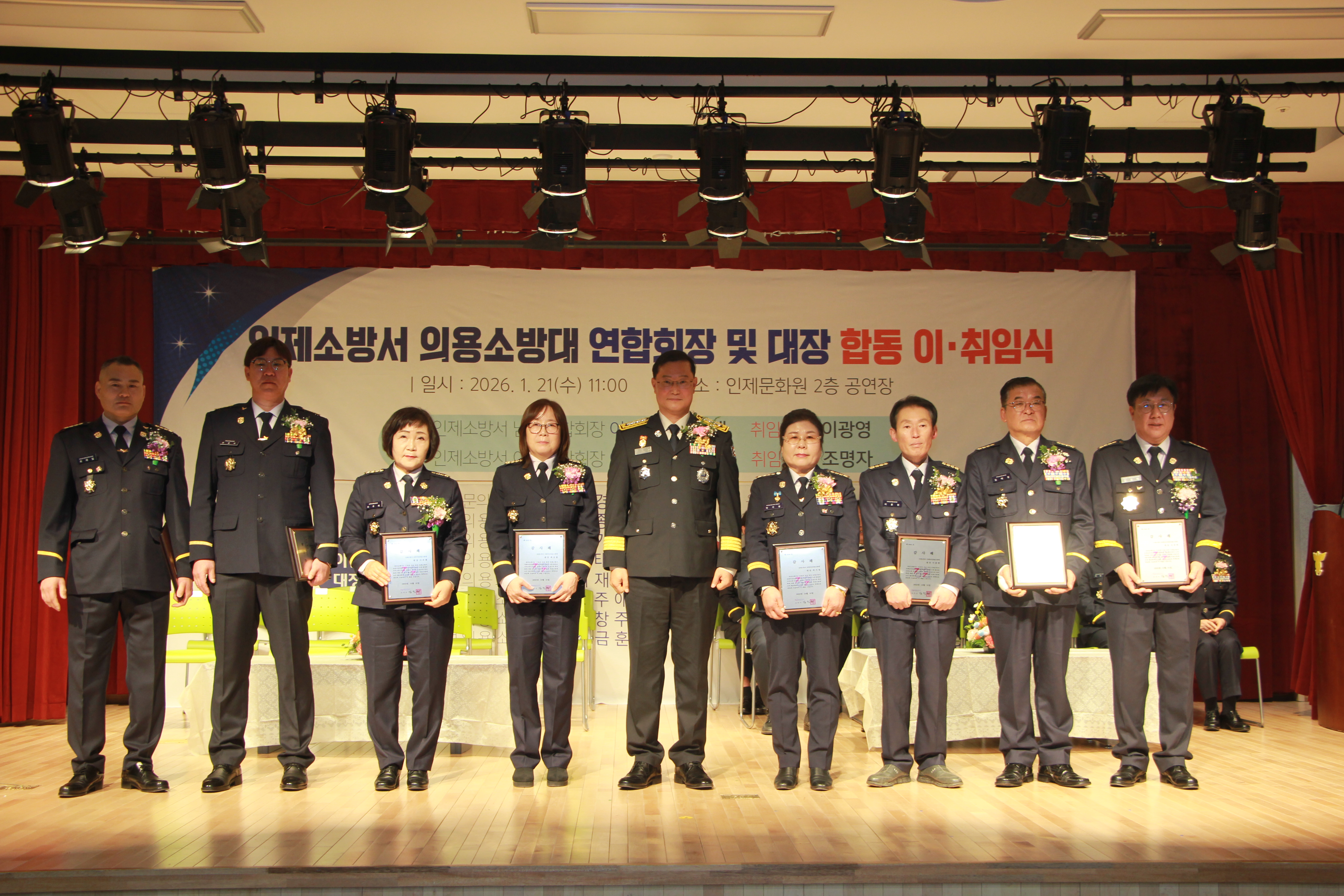인제소방서는 오전 11시 인제문화원 공연장에서 2026년 의용소방대 연합회장 및 대장 합동 이·취임식을 진행하였습니다.