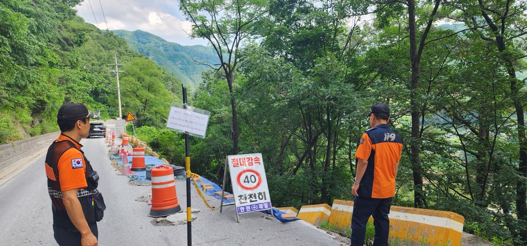 ➤ 이번 점검에서는 침수 및 붕괴 등 풍수해 발생 시 피해예측 유형 확인과 함께 정선군 화암면 북동리에 붕괴되어있는 도로 현장을 점검하였으며 추가 사고발생 방지를 위해 구조대책을 강구했다.