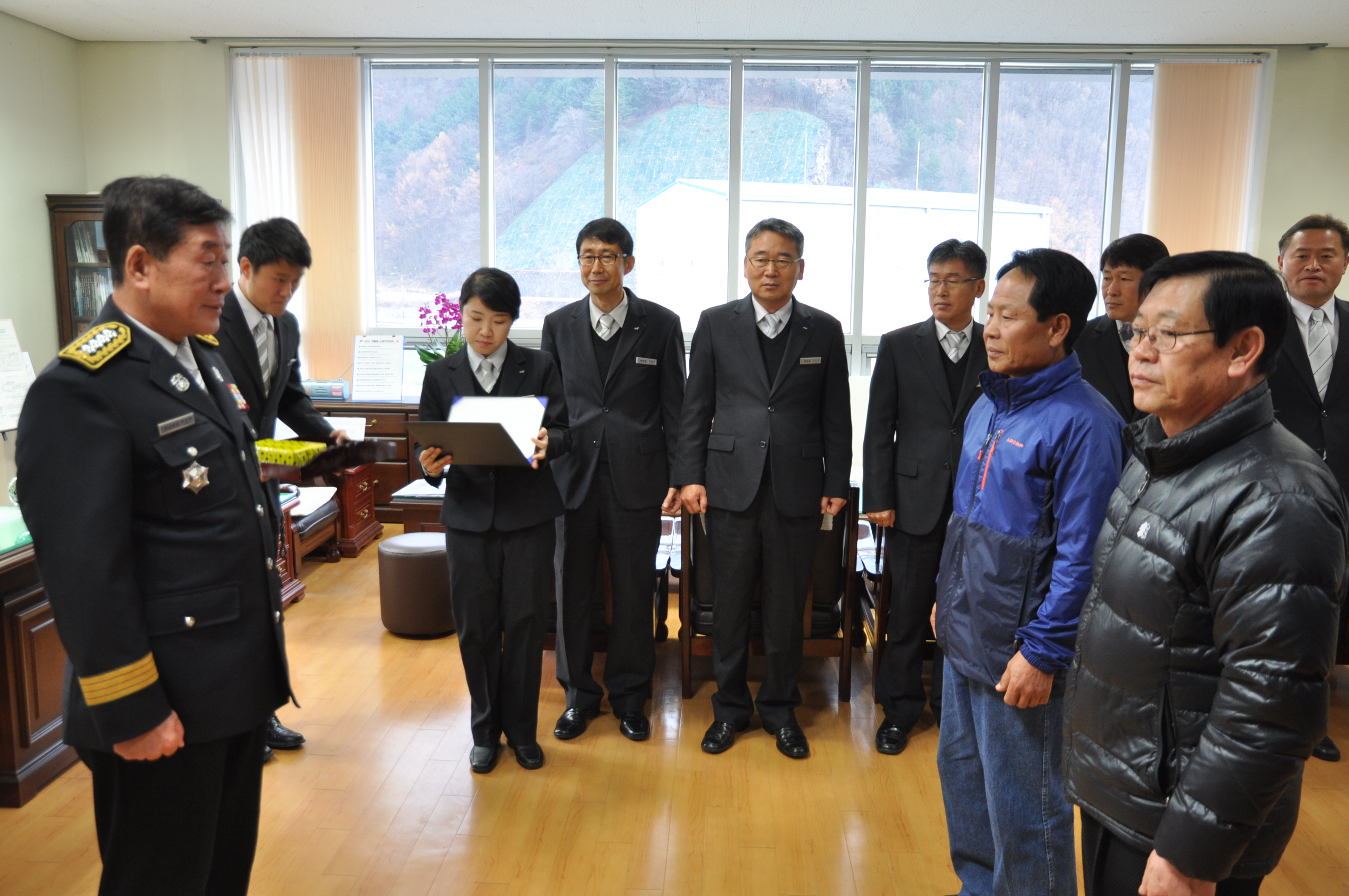 정선소방서(서장 백승렬)은 2014년 11월 17일 본서 서장실에서 봉양리 주공아파트 관리소장님 및 입주자 대표에게 명예 소방관 위촉장 수여식을 실시하였습니다.