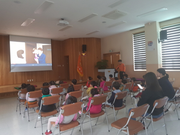 ➤ 이날 교육은 화재발생 동영상 및 심폐소생술익히기 동영상을 보고 함께 이야기 해보는 시간과 심폐소생술 및 물소화기 사용 실습을 통해 생활 속의 안전에 대한 교육 등 어린이의 눈높이에 맞춘 다양한 프로그램으로 진행되었다.