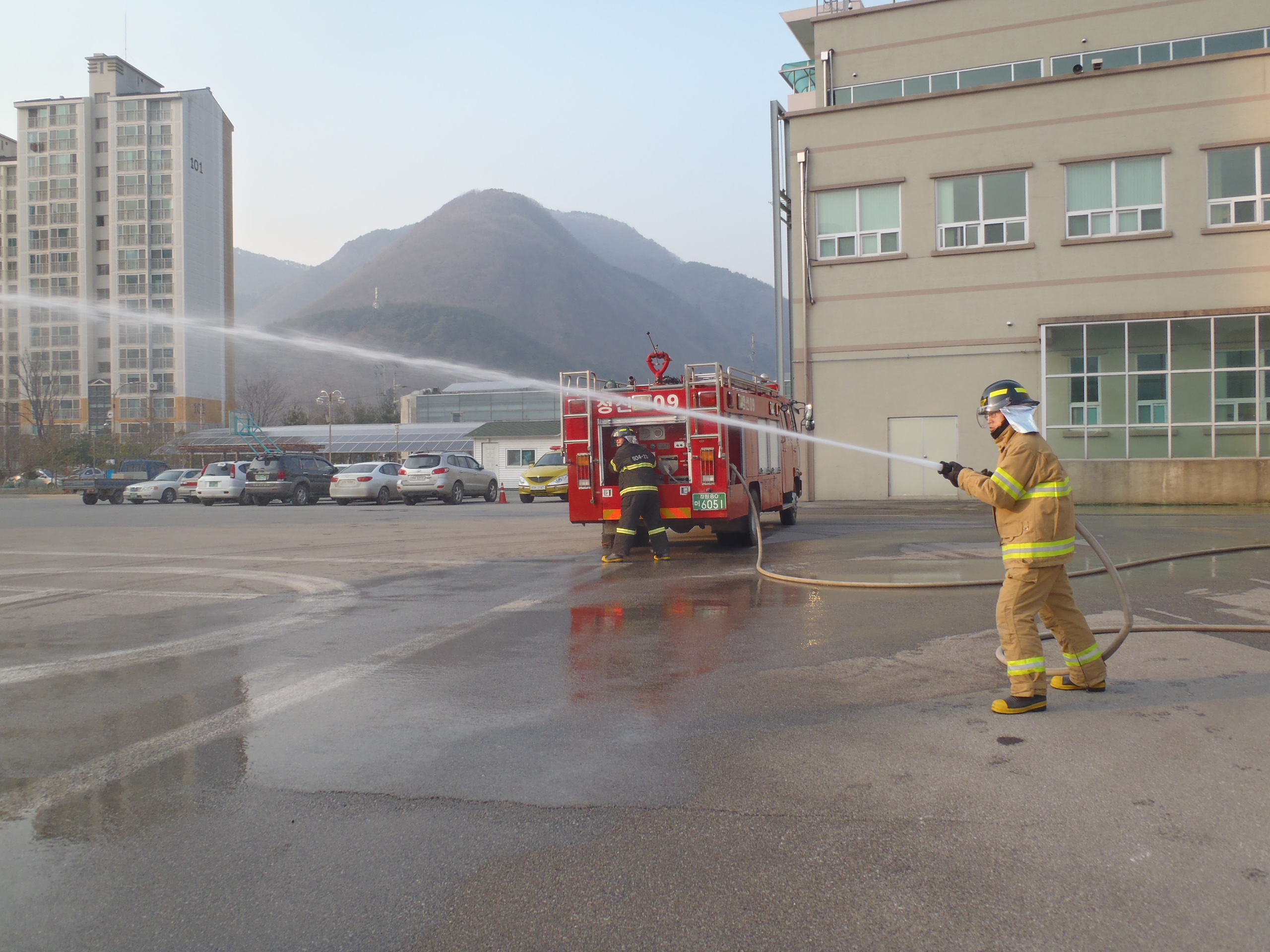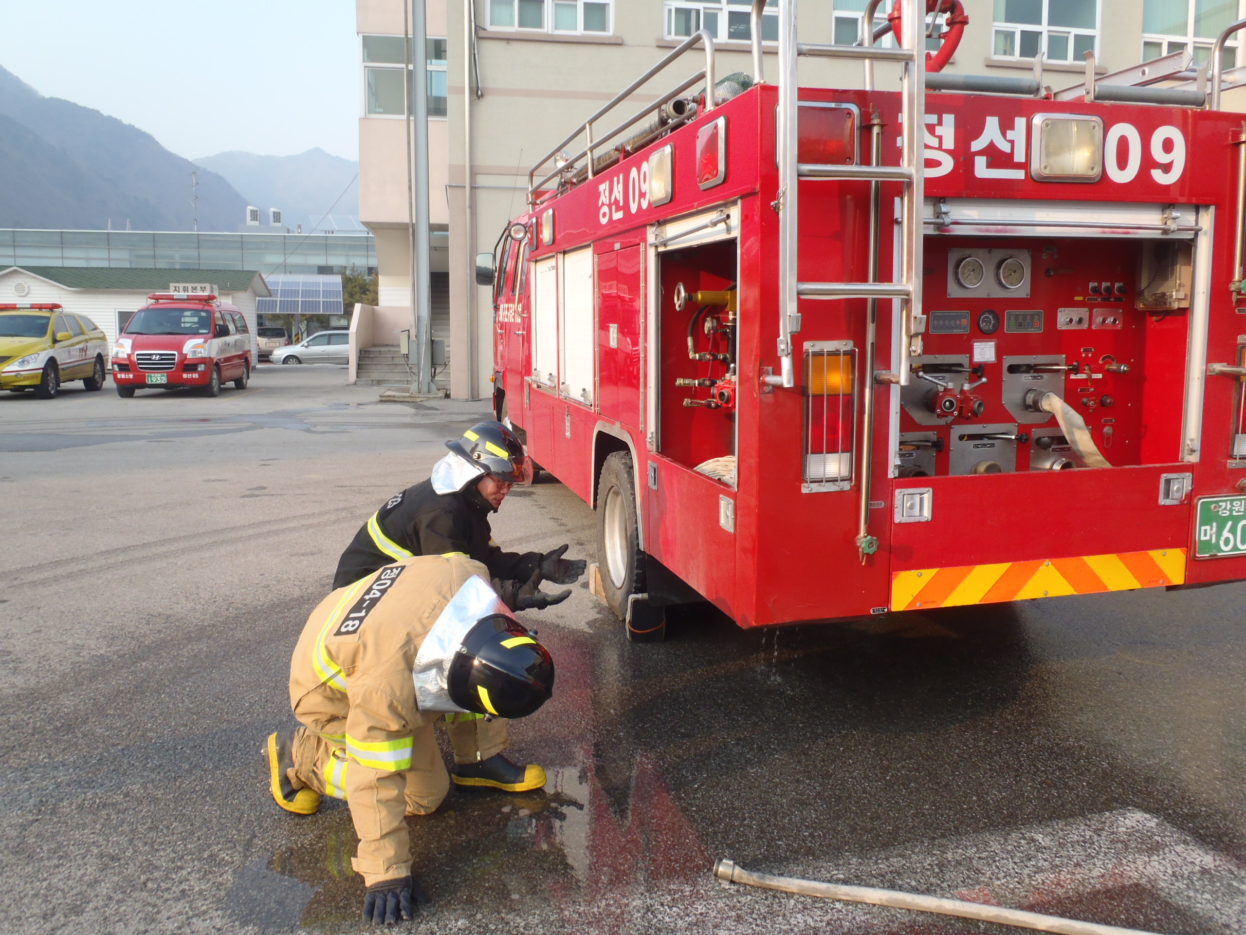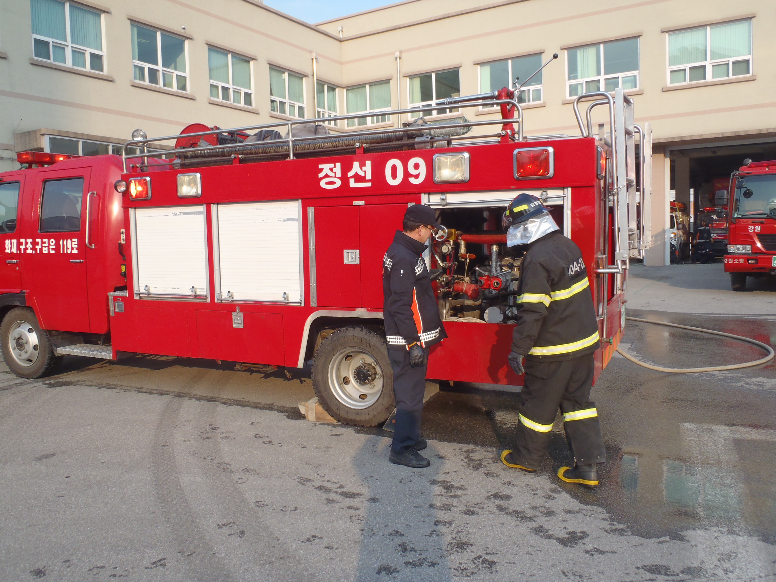 정선소방서(서장 박창진) 정선119안전센터는 2012년 12월 29일에 신규직원 차량조작 훈련을 실시하였습니다. 신규직원의 수관전개 및 관창을 다루는 모습 멋있죠~?!